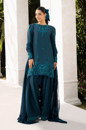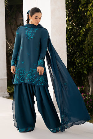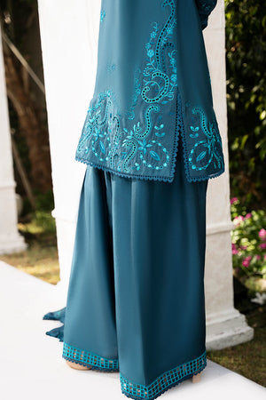 Teal raw silk short shirt with puffy sleeves, designed with monochromatic schiffli embroidery that adds texture and visual interest. The shirt is paired with a farshi shalwar, which is also crafted from raw silk and features intricate cutwork embroidery on the hem. The dupatta, made from medium silk, is detailed with pallu embroidery and scattered bootis, complementing the overall monochromatic theme and adding depth to the ensemble.