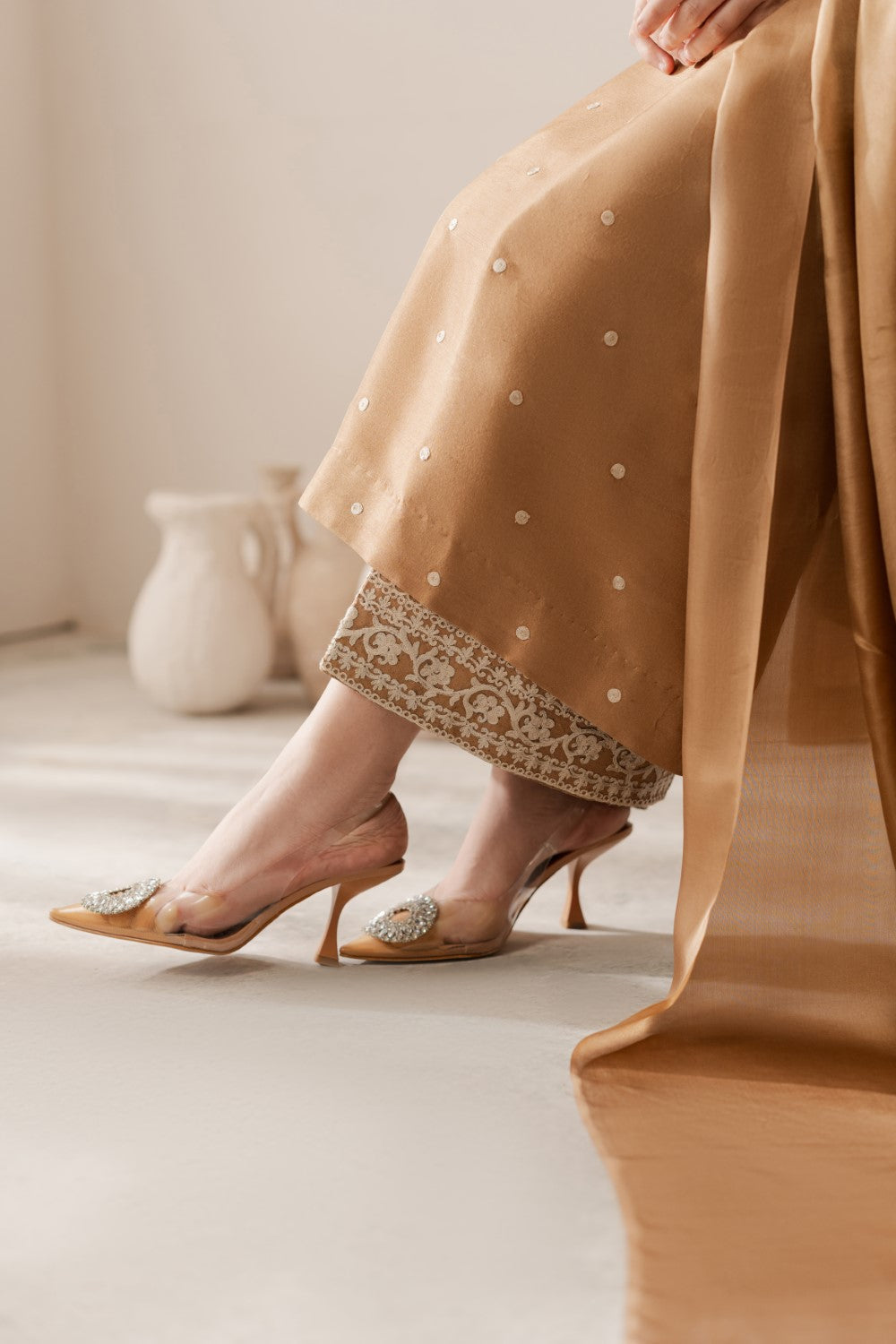 Mystical oriental elements combined with the workmanship of aari embroidery make this rawsilk ensemble a statement piece for every season. The shirt is complimented with embroidered pants to add more royalty to the outfit.