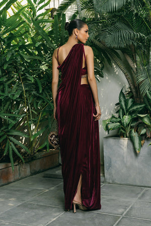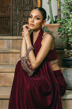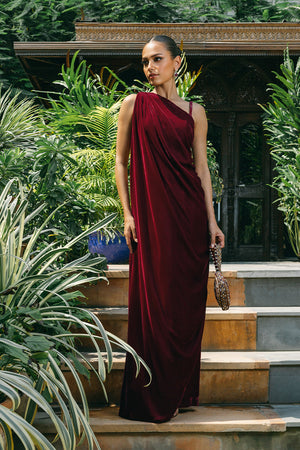 Elevate your festive wardrobe with this striking burgundy halterneck dress, designed to be effortlessly styled with your choice of statement jewelry. The luxurious velvet fabric cascades into a graceful waterfall drape, embodying the perfect balance of elegance and sophistication. Paired with a stunning zardoze-embroidered pouch, this deep crimson masterpiece showcases impeccable tailoring, making it a timeless staple for any special occasion.