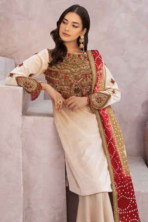 In a captivating Fon color, this straight medium-length silhouette is a vision of opulence, heavily embellished with traditional handwork. The neckline and sleeves are adorned with intricate kora, zardozi, pearls, crystals, and beads, creating a stunning visual appeal. The back of the dress is further accentuated with contrasting tassels, adding a playful touch to the ensemble.This dress is paired with Masoori peplum sharara pants, enhancing its overall elegance. The look is completed with a multi-color chunri dopatta, adorned with laces and tassels, adding an extra layer of charm.