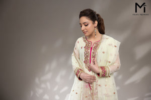 A dress to impress” This pistachio attire is adorned with embroidery and graceful hand embellished neckline, special attention to hem and sleeves with shocking pink and multicolor embroidery style makes it closer to MAAN MEHRAN signature taste. Paired with embroidered pants,and all sided embroidered organza dupatta. Be your own kind of beautiful.