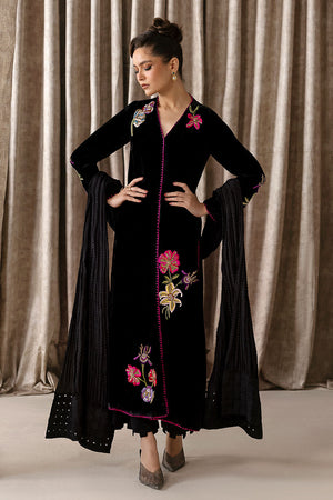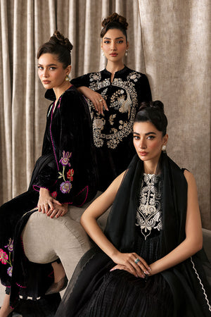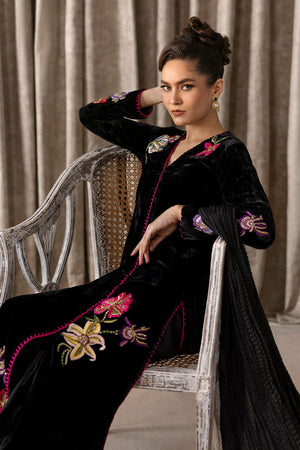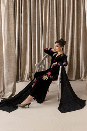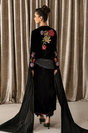 A Luminous pure black velvet is adorned with thread and handwork floral motives in front back and sleeves. It is paired with crush silk dupatta with border design.