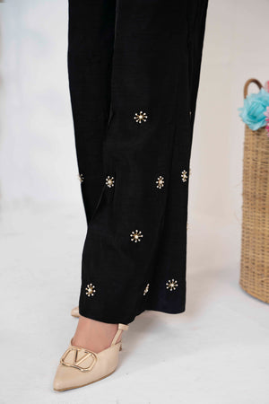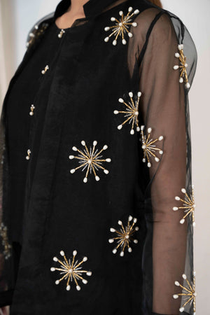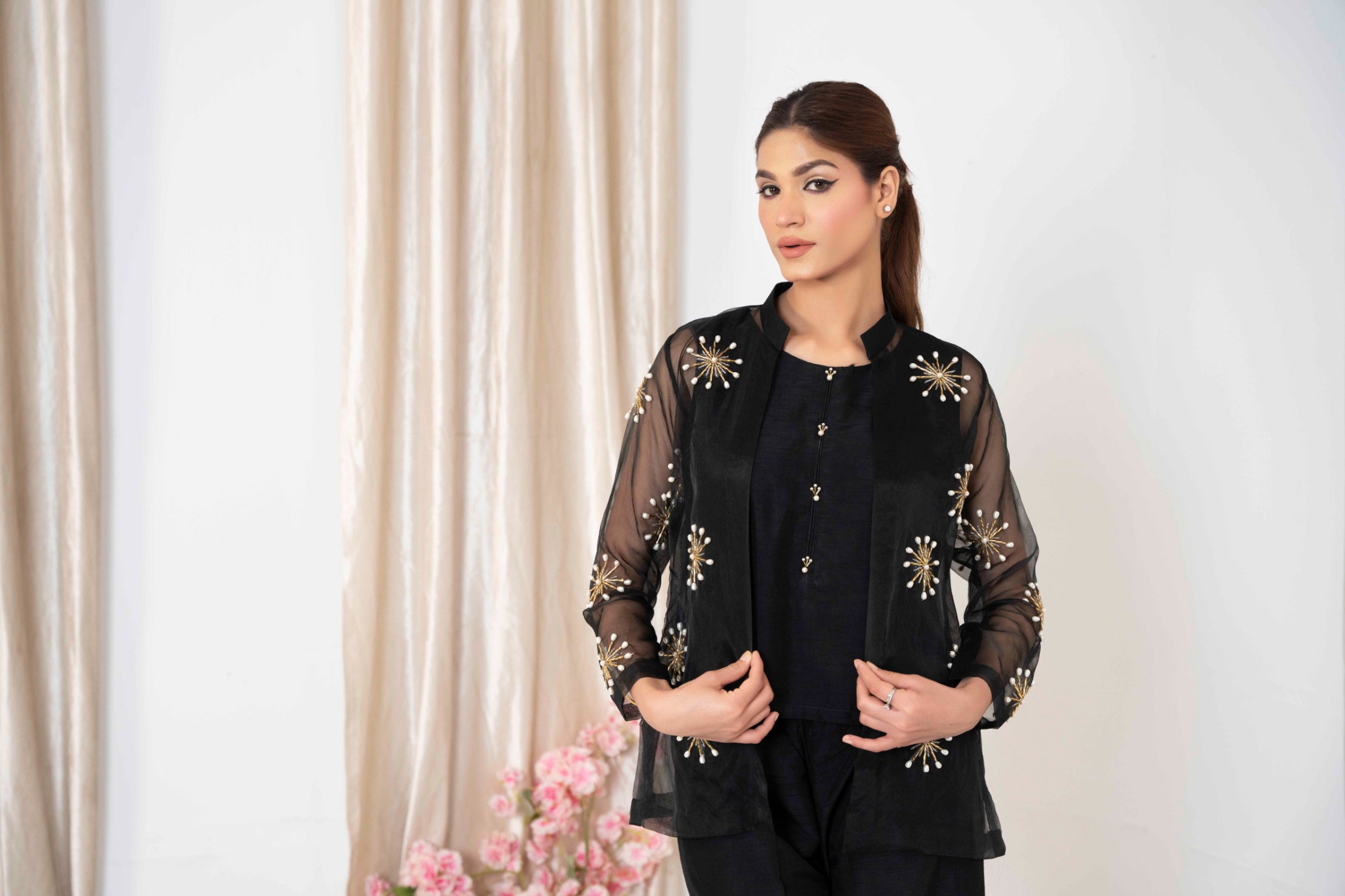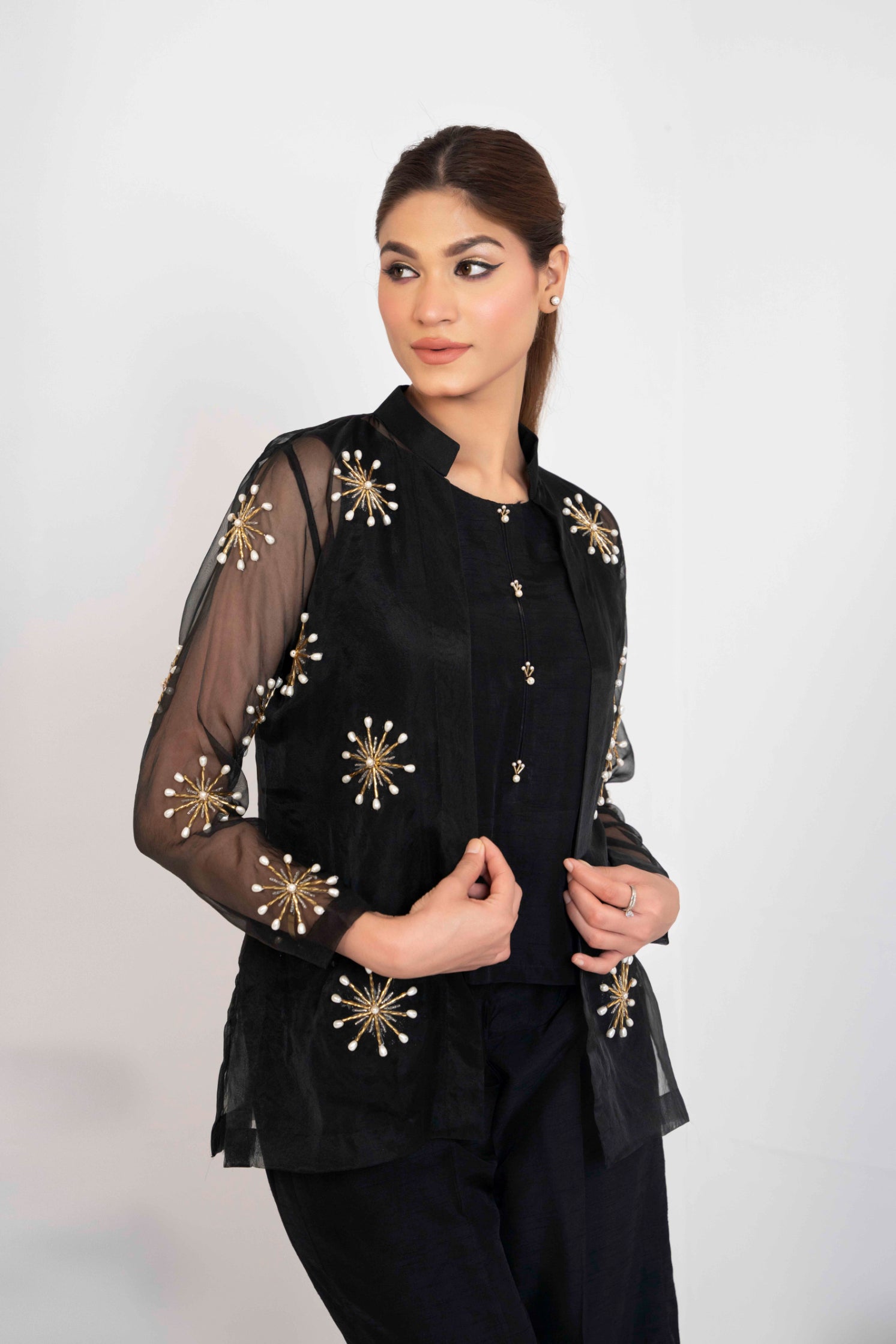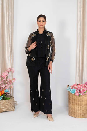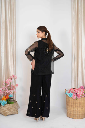 Step into elegance with this tricking ensemble featuring a black organza jacket embellished with adds work paired with inner and flared embellished trousers.