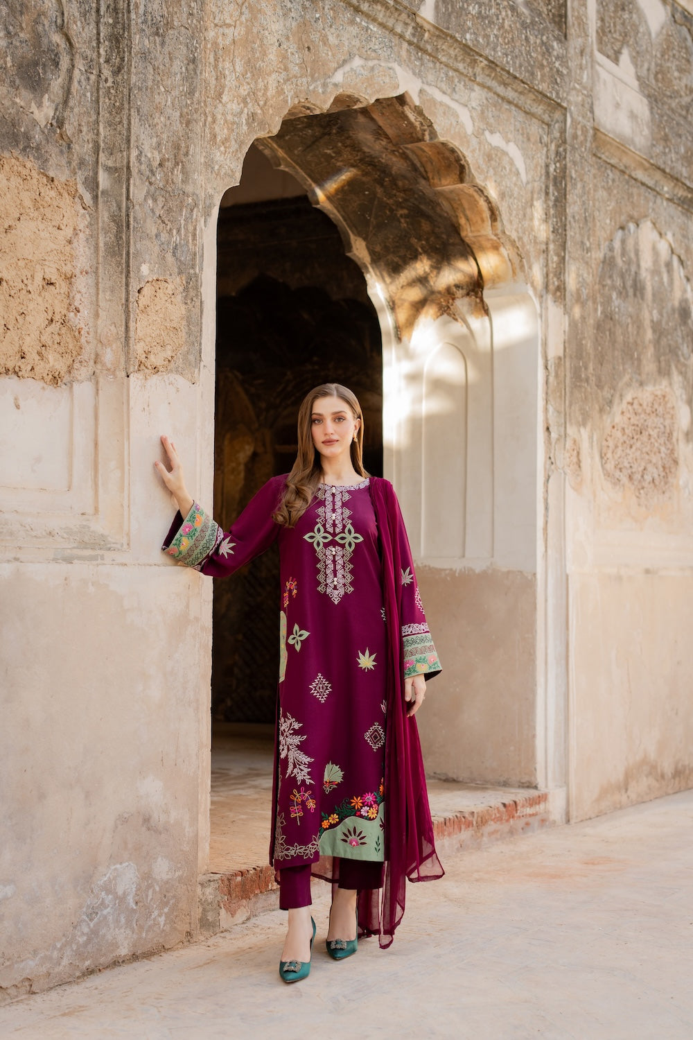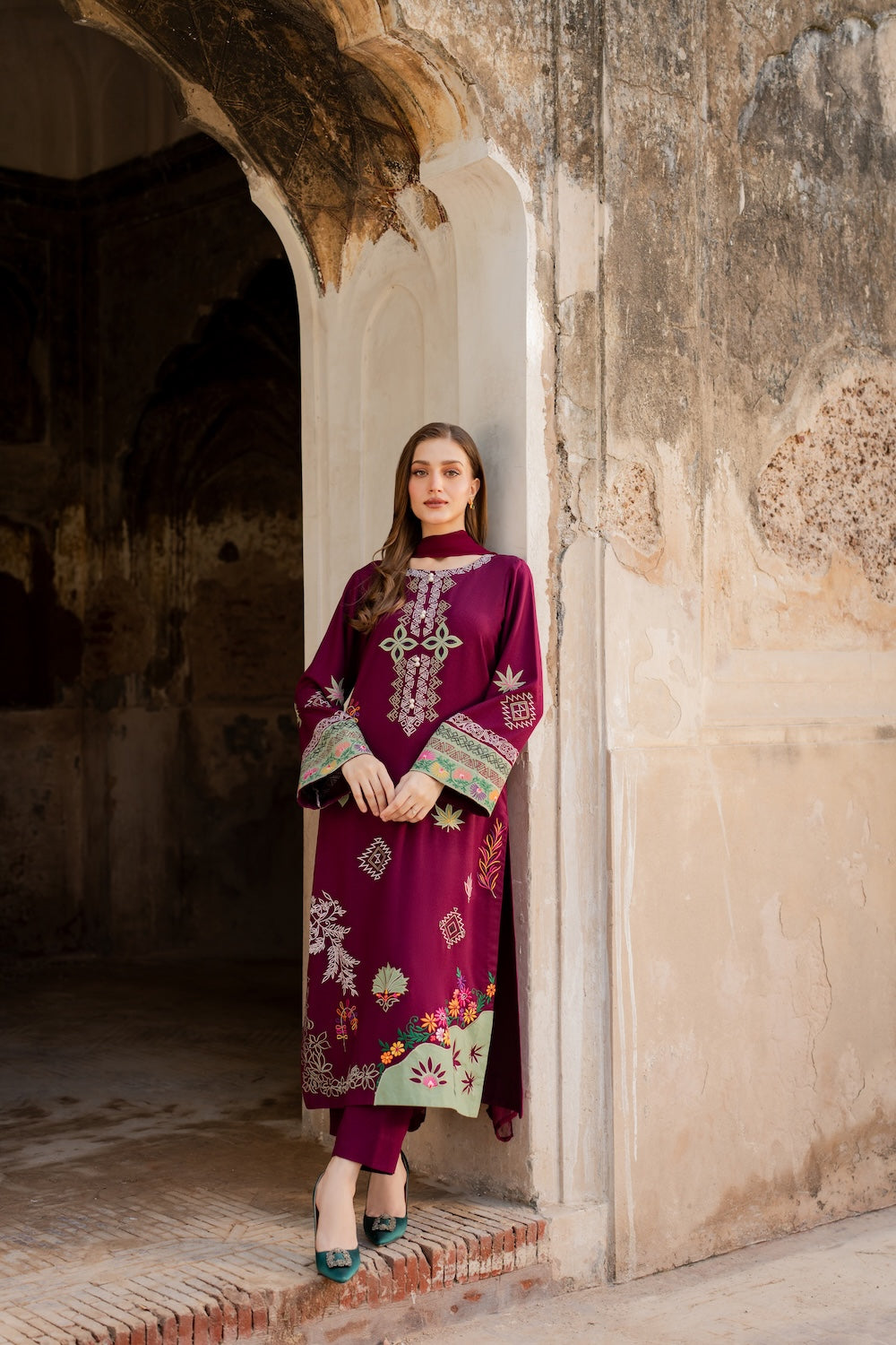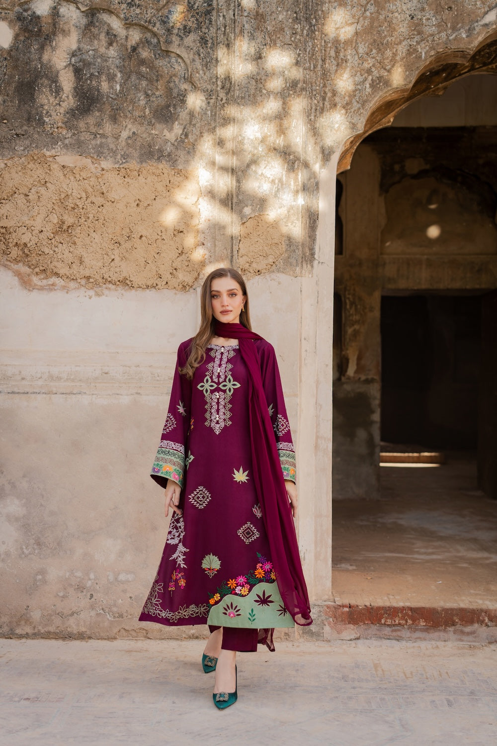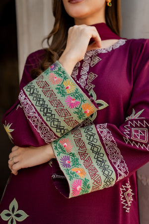 This winter, make a bold statement with a striking magenta outfit that’s lifted by a fresh mint‑green color block, creating a dynamic yet sophisticated contrast. The design is enriched with scattered geometric embroidery, while an intricately crafted neckline adds a touch of refined detail. Together, these elements transform the piece into a versatile must‑have—perfect for festive gatherings, office celebrations, or an elegant evening out. Its balanced blend of color, texture, and subtle embellishment ensures that it stands out .