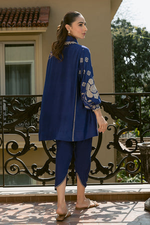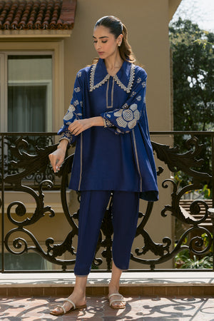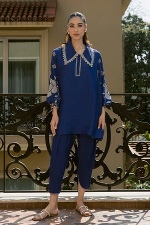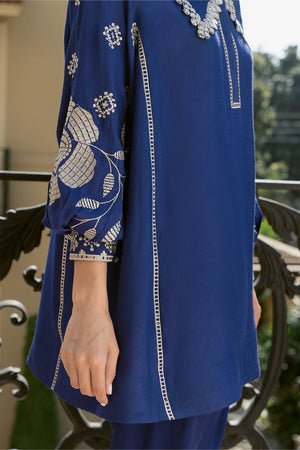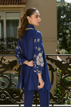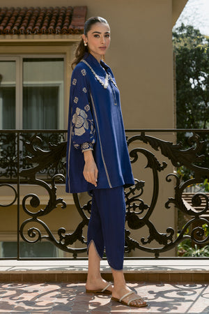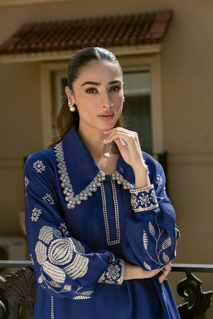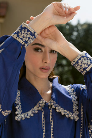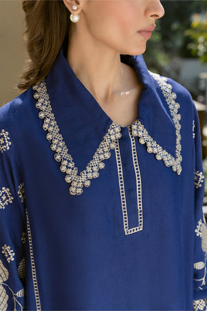 Add a touch of refinement to your everyday style with our stunning indigo blue Sorud set, expertly cut from premium spun net. The set showcases exquisite fine beige-hued embroidery on the sleeves, beautifully complemented by geometric-inspired appliqué and intricate neckline detailing. Paired with a matching khaddi silk skinny shalwar, this ensemble is perfect for effortless, year-round sophistication.