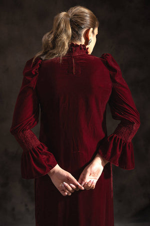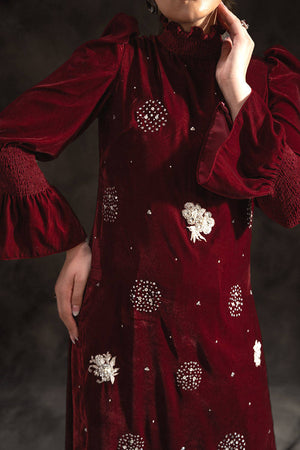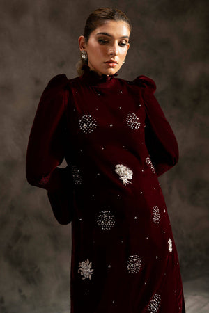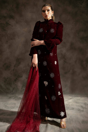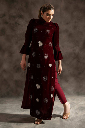 A striking maroon long slim-fit shirt showcases an array of stunning silver sequins and intricately embellished motifs, making it a true statement piece. The design features contemporary elements such as a pleated turtle neck and elegant puff sleeves, enhancing its modern allure. Paired with matching straight pants, this look exudes sophistication and is ideal for any event.