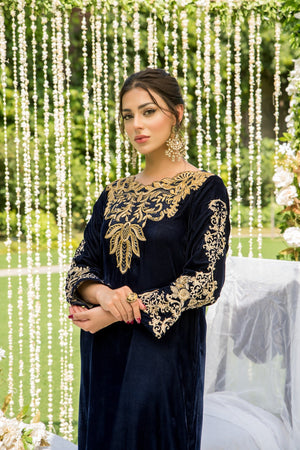 Fabric: Falcon 9000 micro velvet. •Details: Fully Embroidered neckline with embroidered sleeves, lace detailed hem while paired with jamawar pants. • Length: length is 50 for all sizes