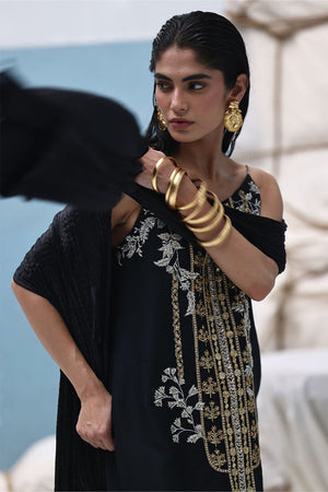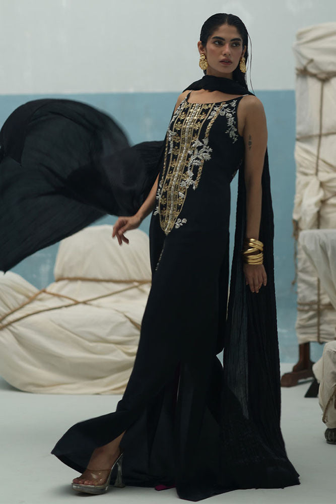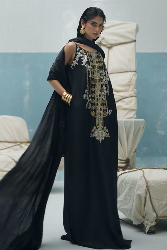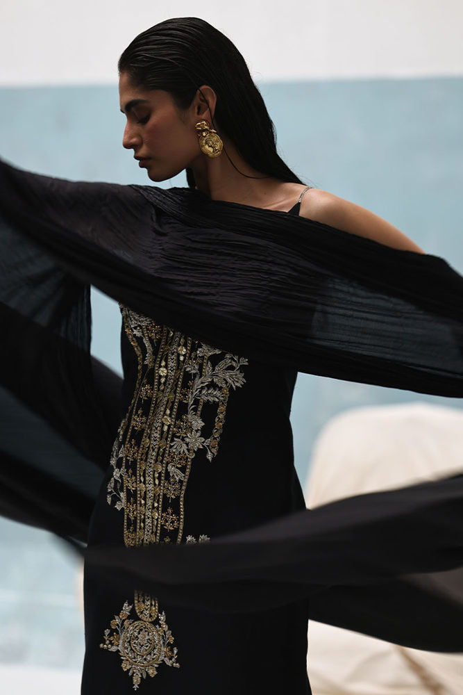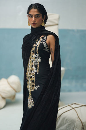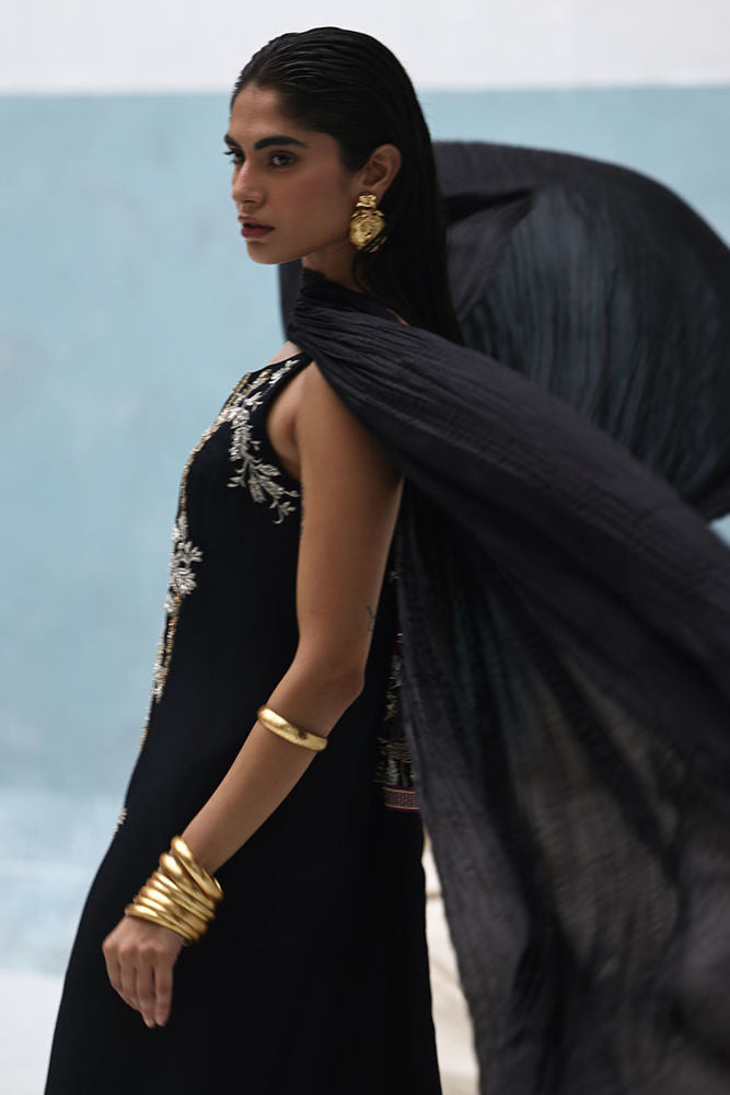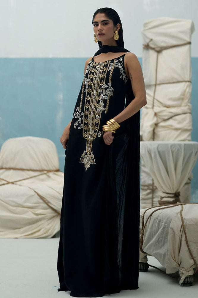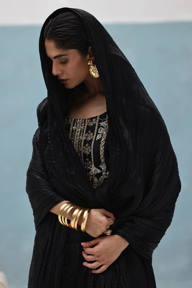 Black pure raw silk kaftan featuring gold and silver zardozi embroidery with kora, dabka, nakshi, cutdana, moti, tikki stones, gotta, and sequins. The dupatta is adorned with delicate crush crystals hanging gracefully on the pallu.