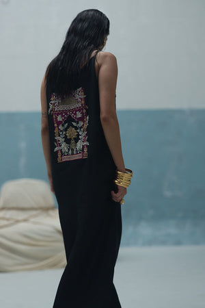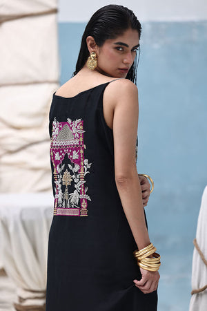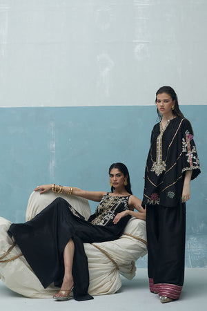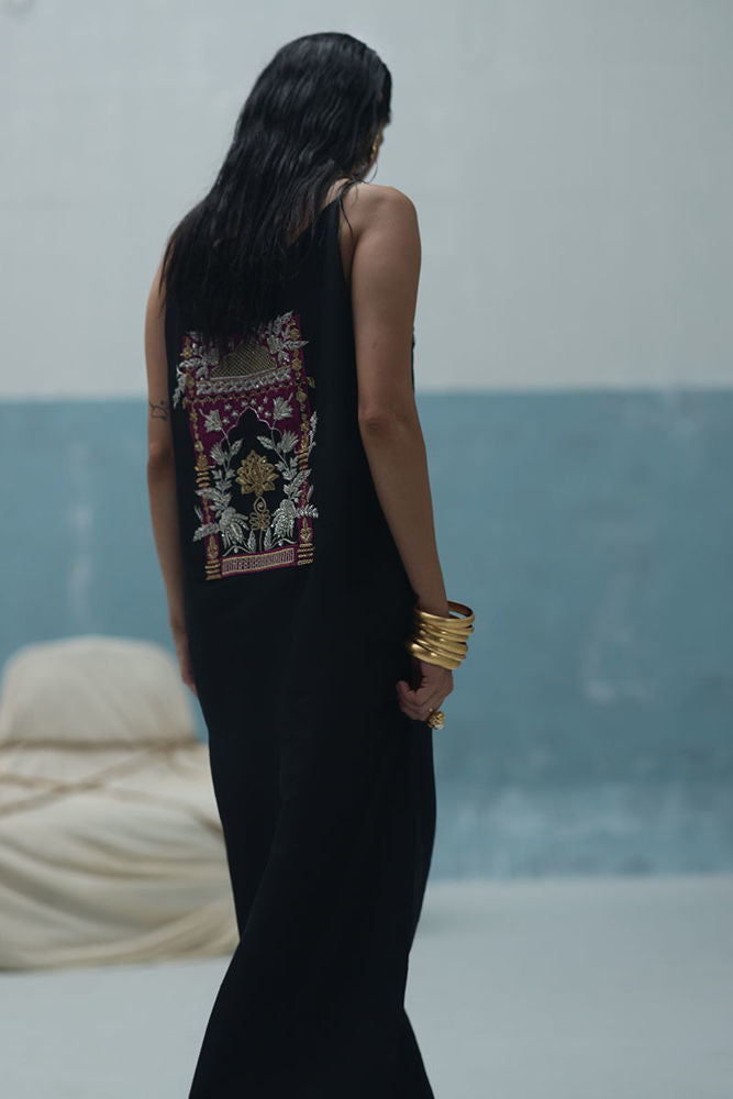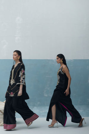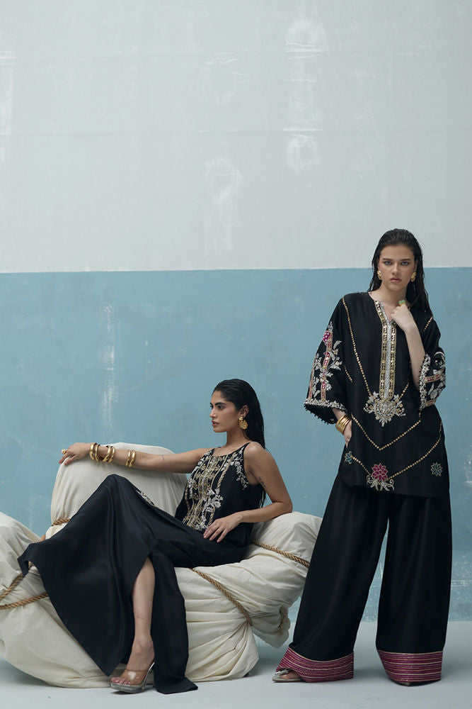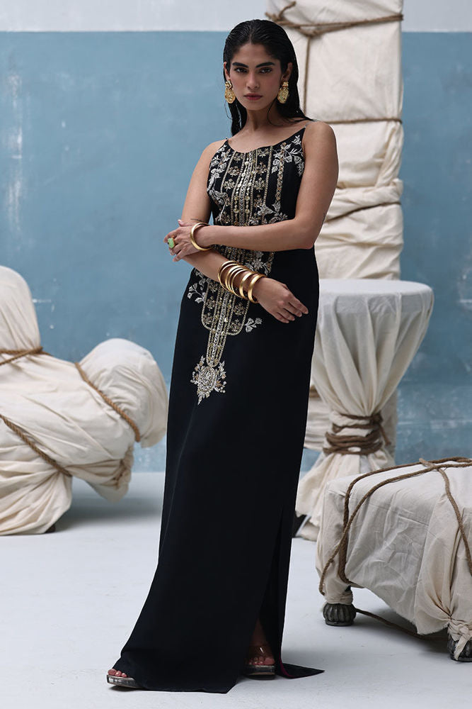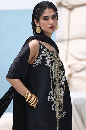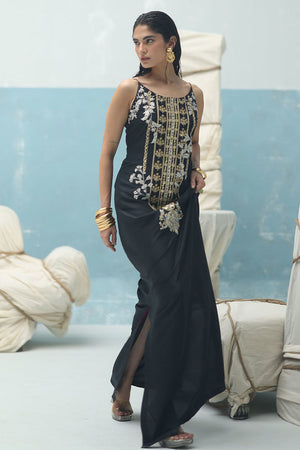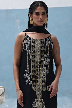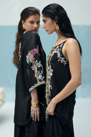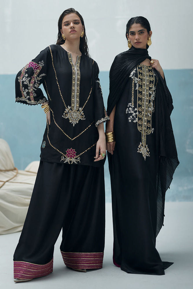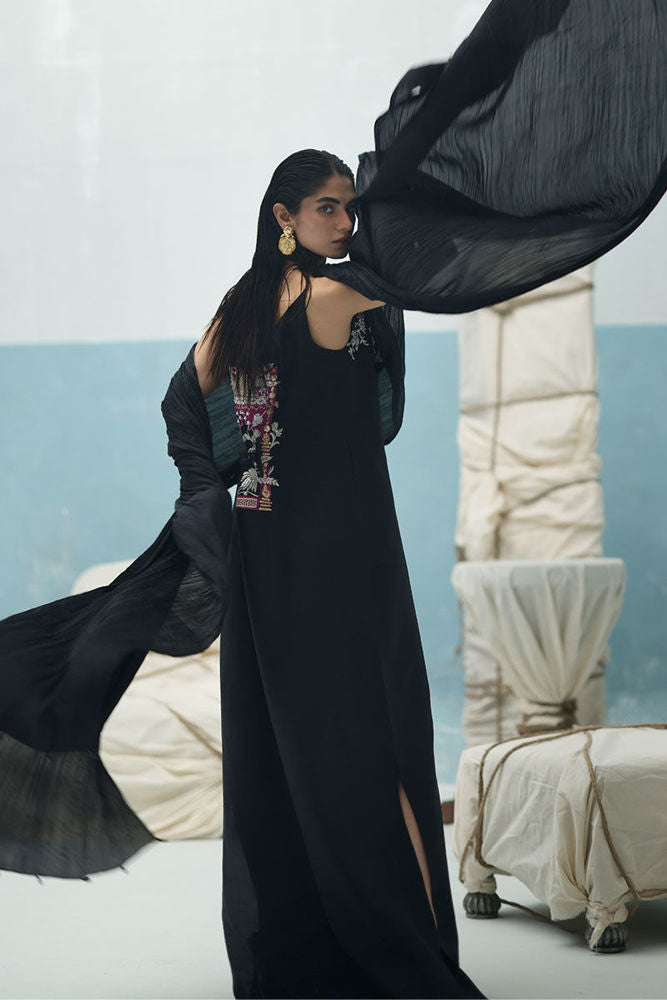 Black pure raw silk kaftan featuring gold and silver zardozi embroidery with kora, dabka, nakshi, cutdana, moti, tikki stones, gotta, and sequins. The dupatta is adorned with delicate crush crystals hanging gracefully on the pallu.
