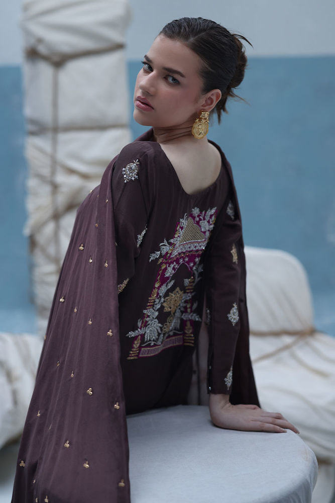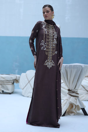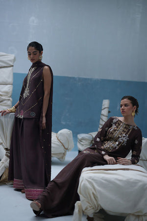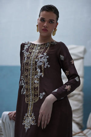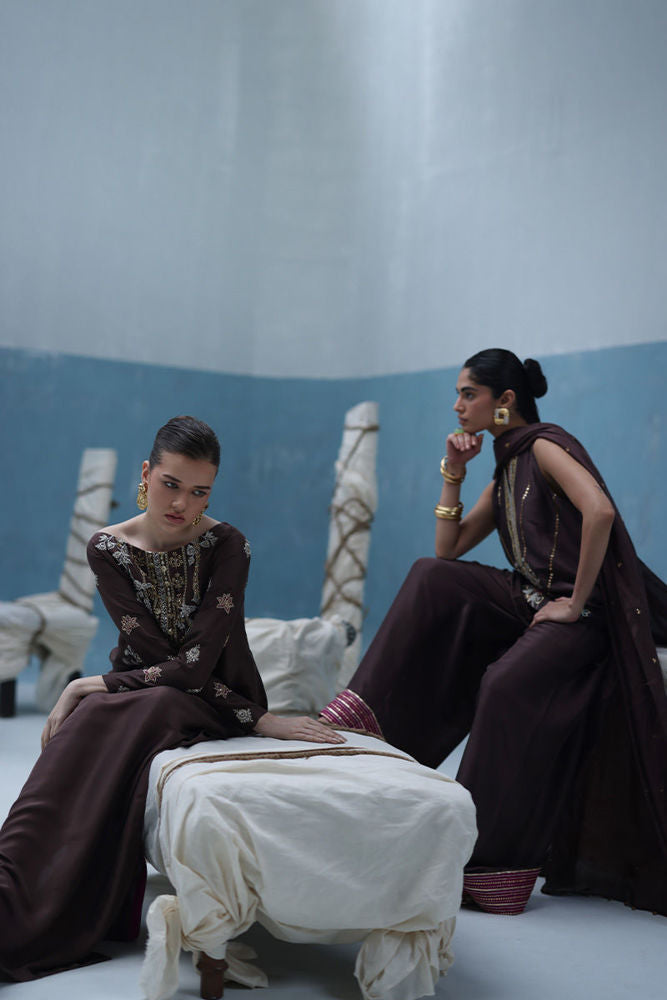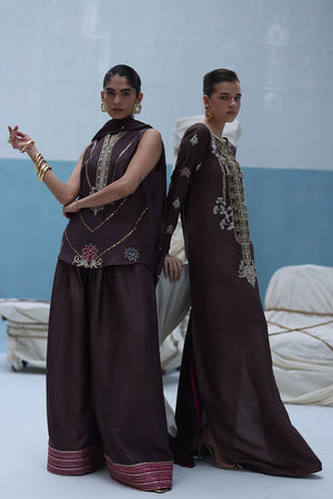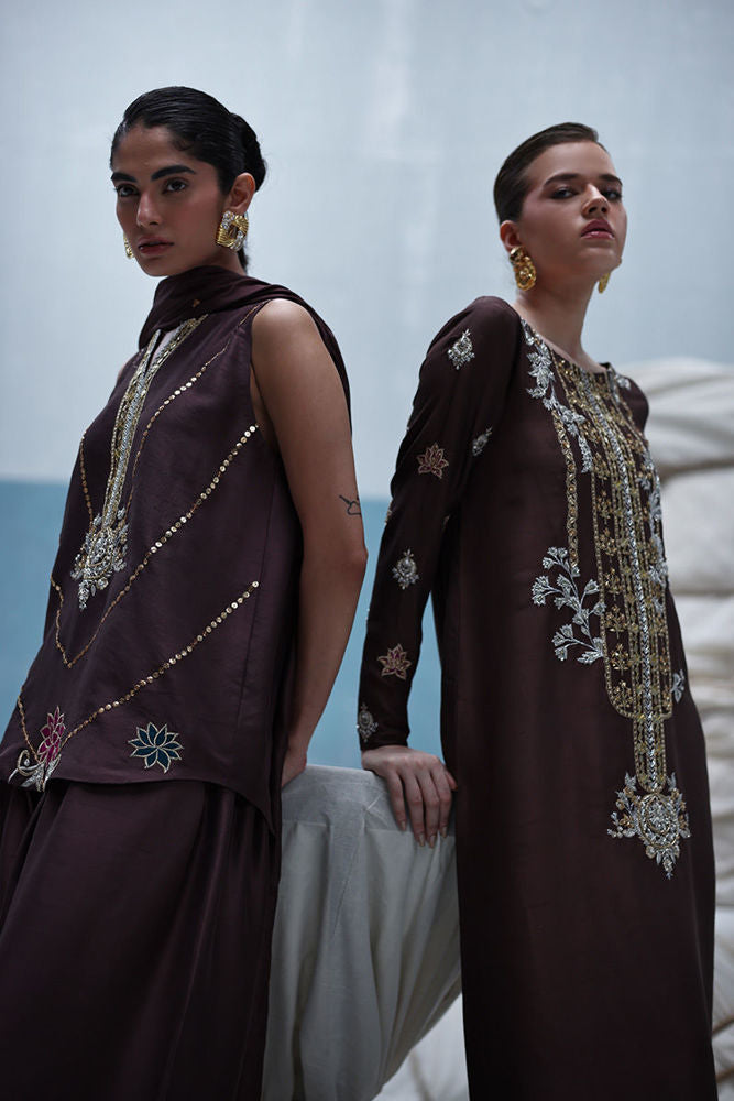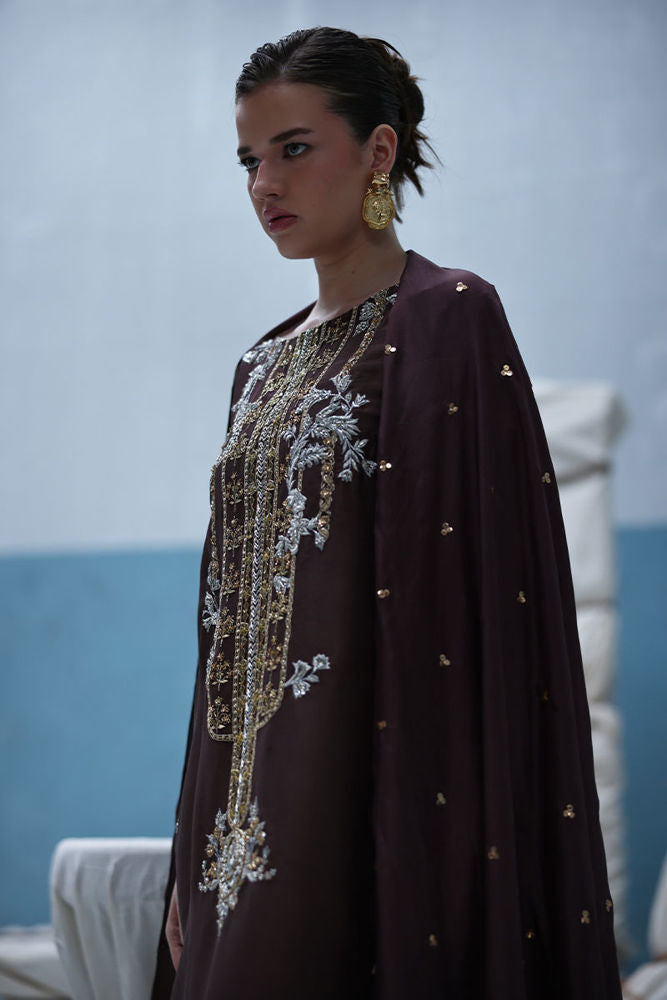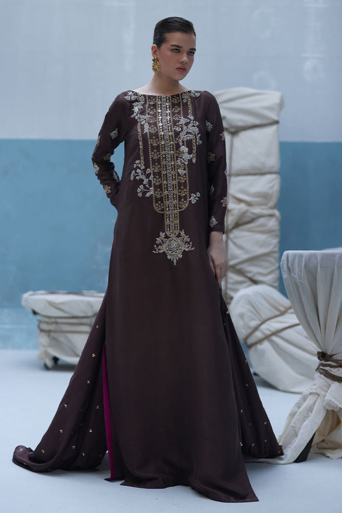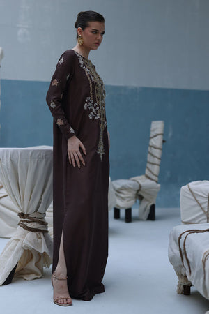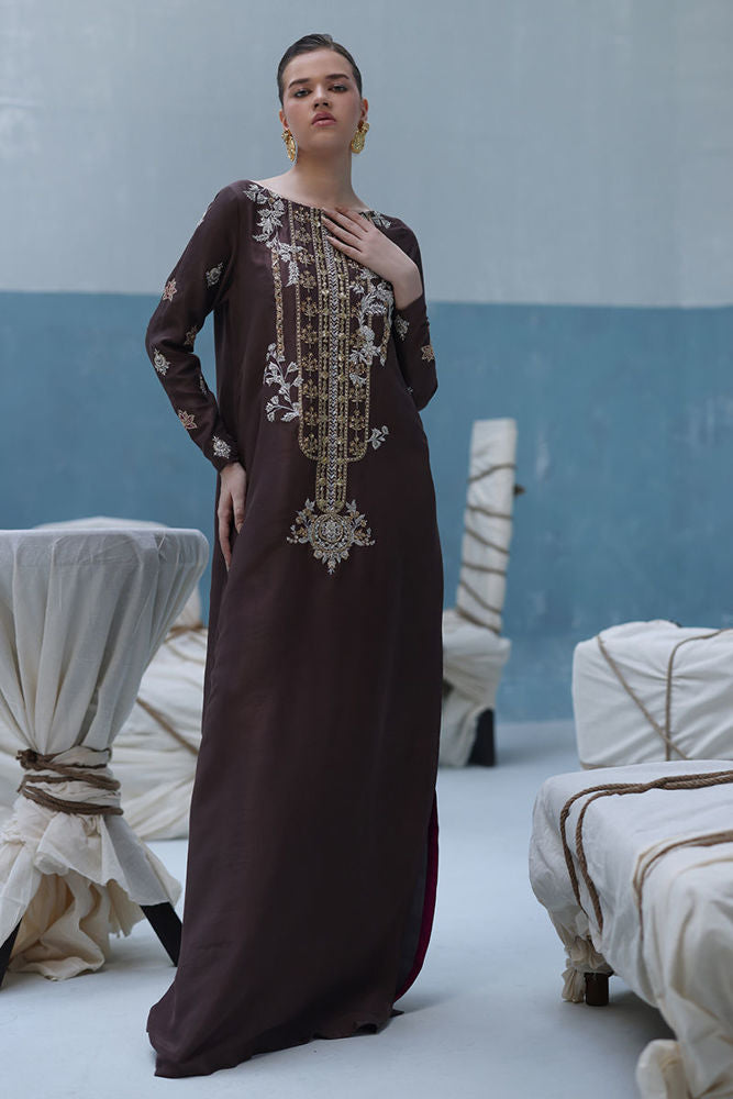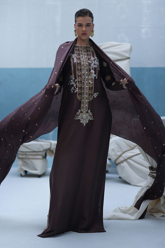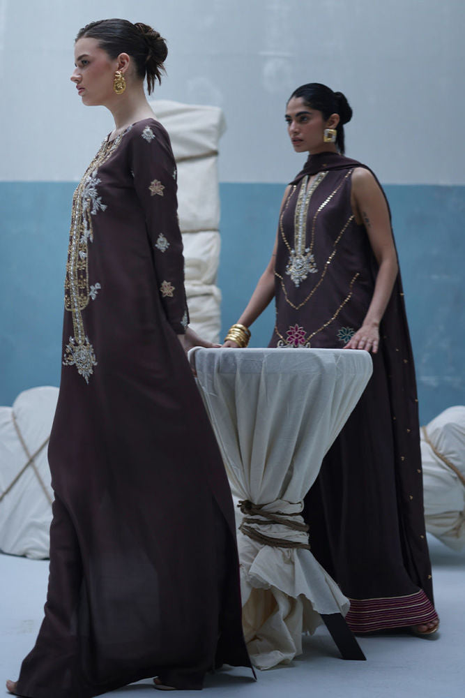 Deep Taupe raw silk kaftan featuring gold and silver embroidery with intricate zardozi work using kora, dabka, nakshi, cutdana, moti, tikki stones, gotta, and sequins. Paired with a pure medium silk dupatta embellished with crystals hanging on the pallu and sequins scattered throughout.