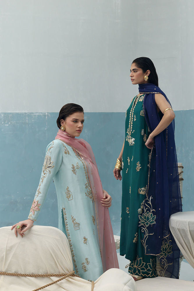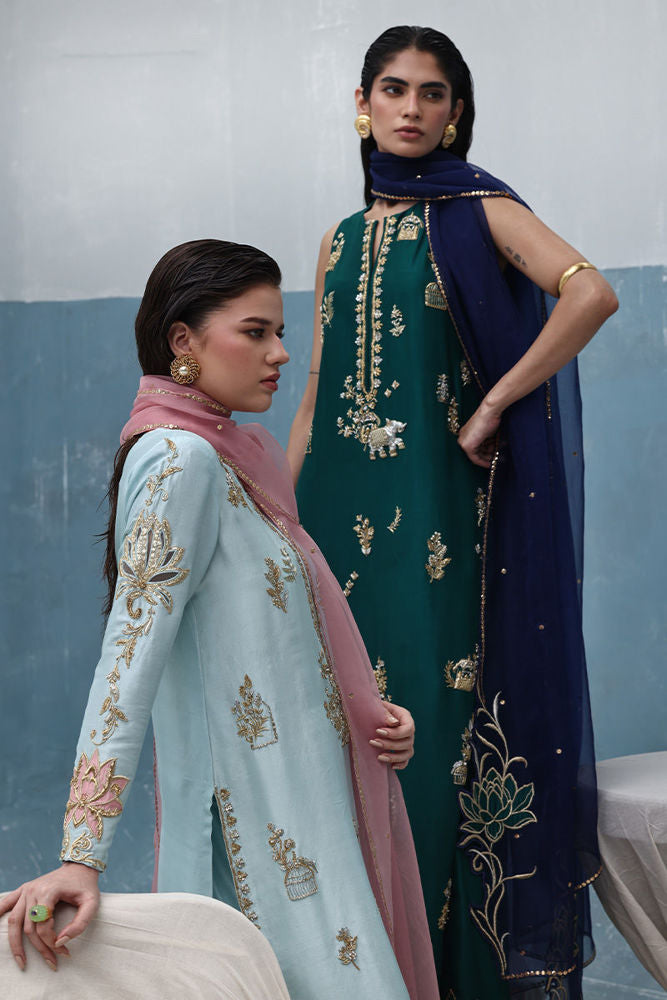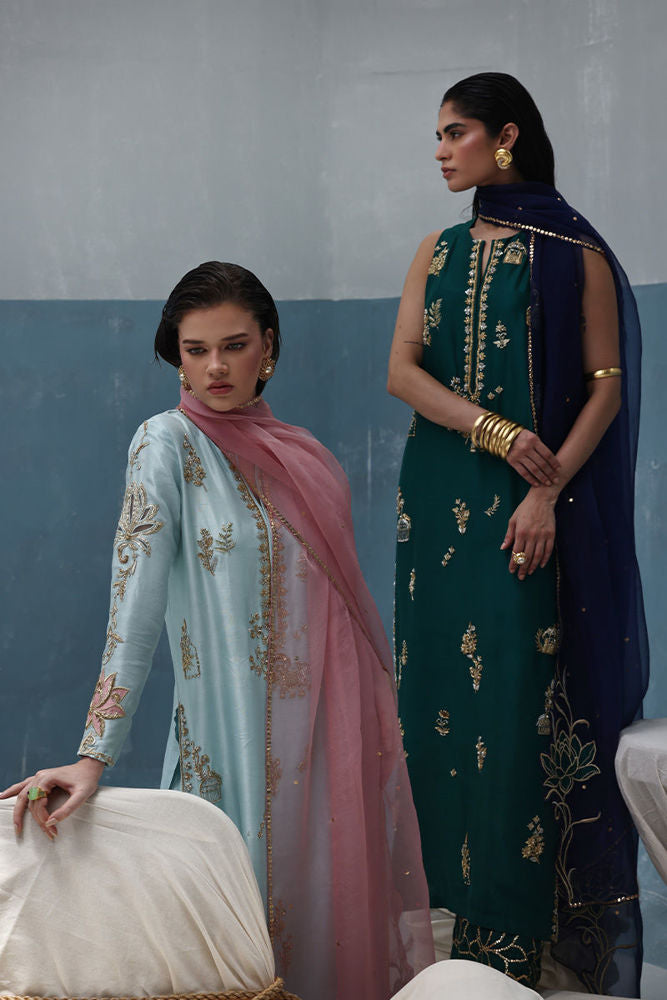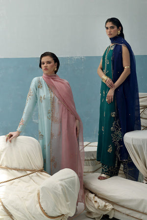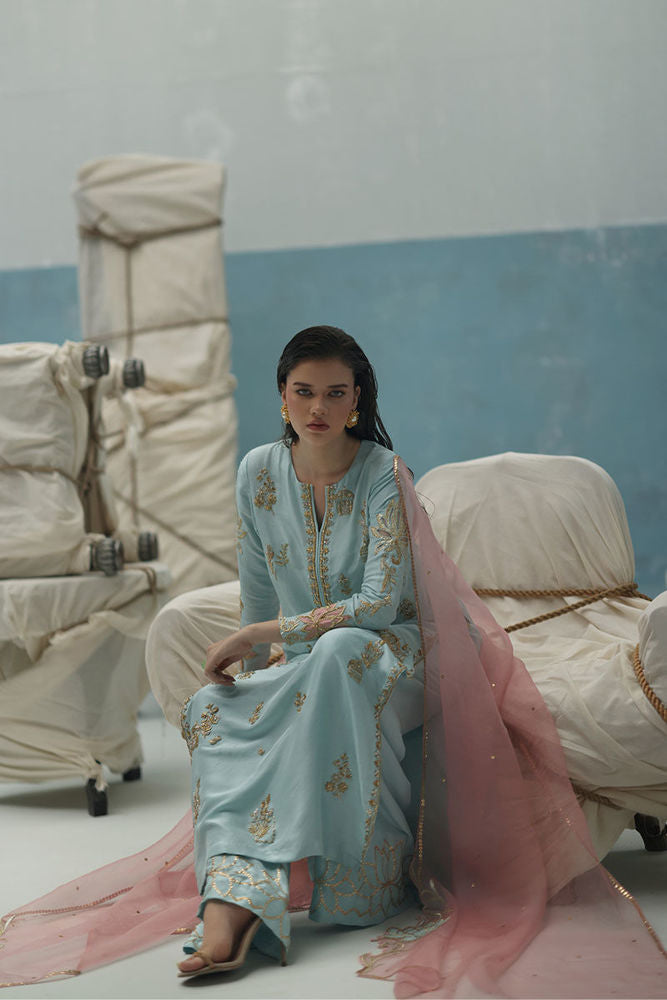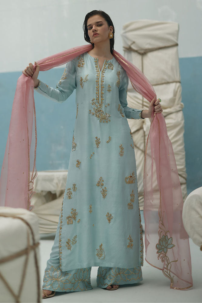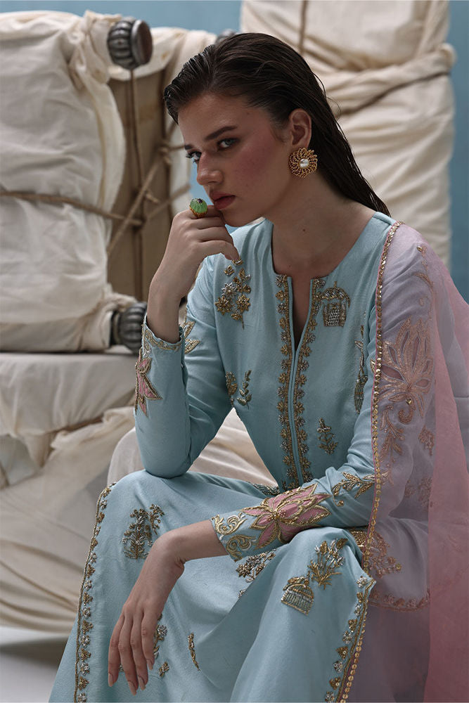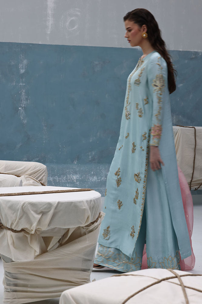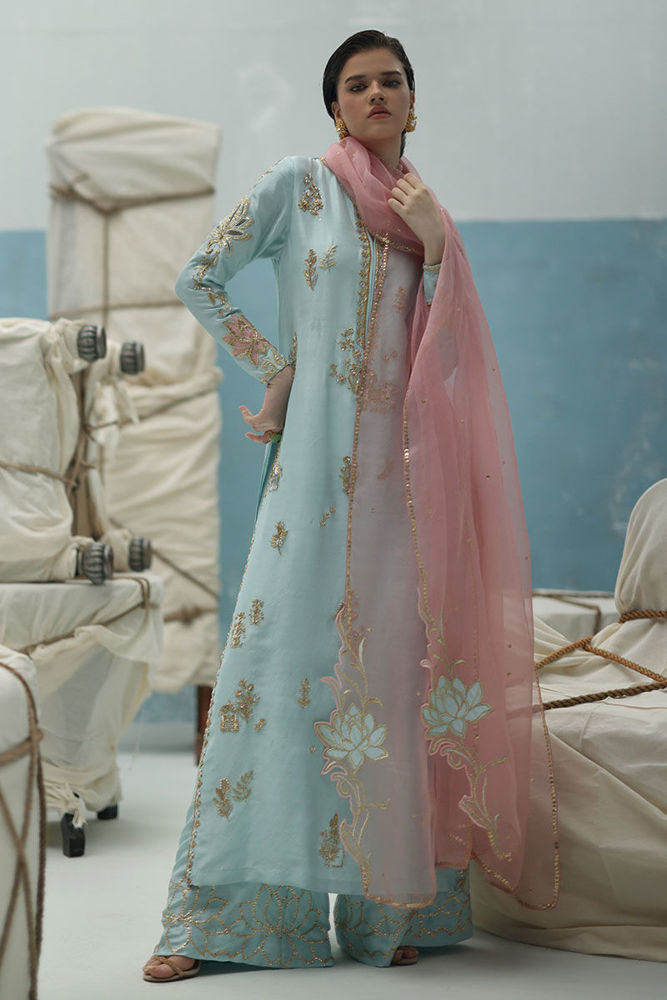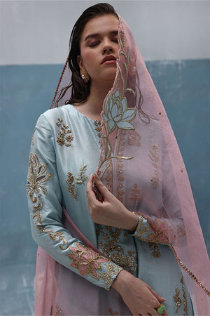 Pure zardozi work on the front with gold and silver kora, dabka, naqshi, moti, pearls, and sequins on the sleeves, complemented by gold resham embroidery with applique and handwork. Pure raw silk clottes with handwork on the bottom, paired with a blush pink pure organza dupatta featuring handwork and zari embroidery.