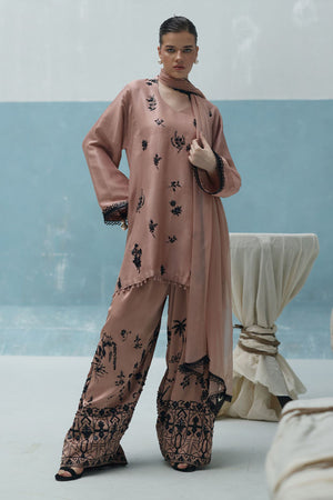Loose-cut pure raw silk kurta with all-over screen-printed bunches, adorned with handwork of cutdana, crystals, moti, sequins, and 3D flowers. Paired with crepe silk Farshi shalwar featuring screen print and hand embellishment, and a crinkle chiffon dupatta finished with lace on all four sides.