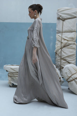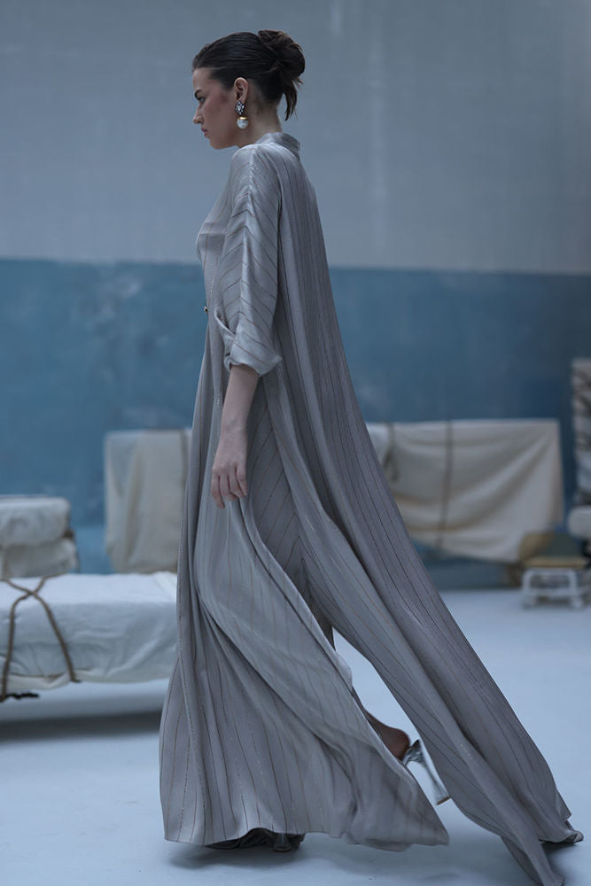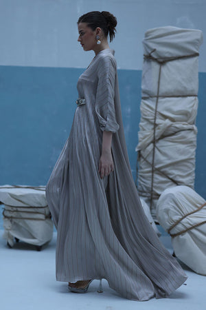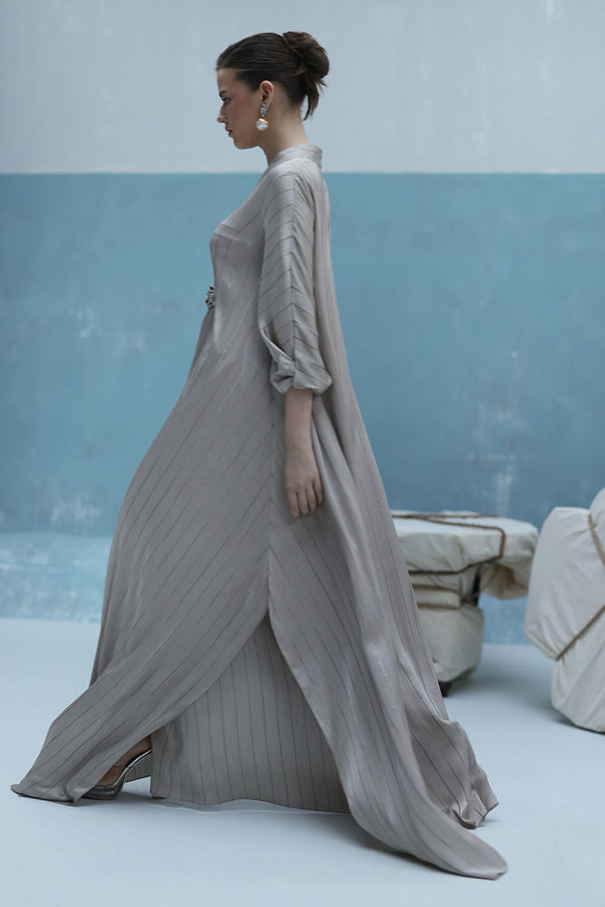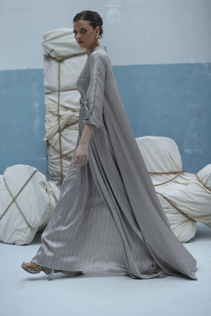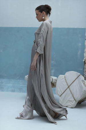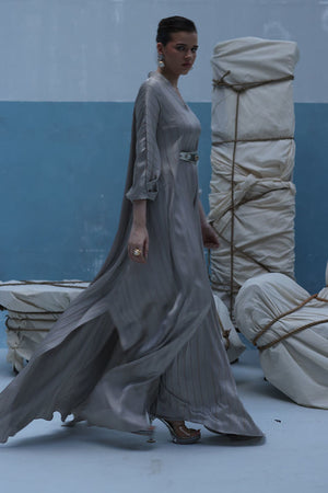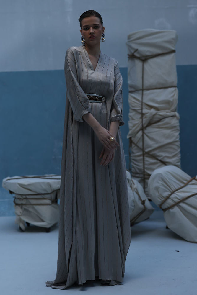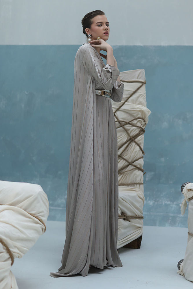 Silver grey kaftan in crinkle silk with gold and silver stripes, featuring a box pleat and a statement leopard belt. Paired with crepe silk pants for a sleek, contemporary finish.