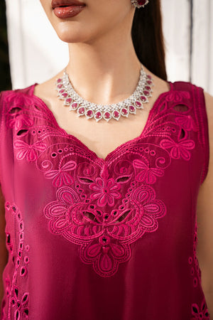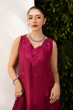 Sleeveless pure raw silk magenta shirt, designed with oversized schiffli embroidery in monochrome colors. The shirt is finished with a cutwork neckline for added detail. It is paired with straight raw silk magenta pants, maintaining the monochromatic theme. The medium-weight silk dupatta is enhanced with cutwork and organza appliqué details, adding texture and contrast to the ensemble.