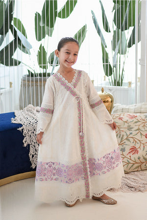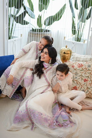 White in-house signature schiffli angarkha completed with a Schiffli border along with satin stitch embroidery in periwinkle, mint and lilac shades and self embroidery borders with finishings of laces and tassels. Paired with cotton dyed pants.