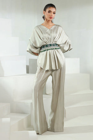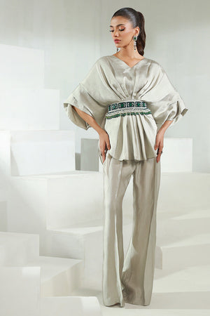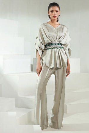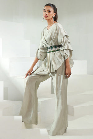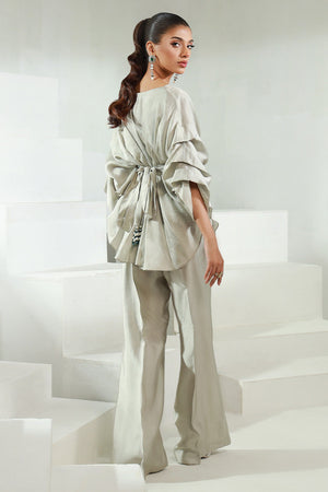 Crafted in premium sheesha silk, this butterfly cut cape exudes elegance and sophistication. The design's allure and distinctive cut make a statement on their own. It comes with a meticulously handcrafted green and white belt adorned with hanging pearl details. Paired with boot-cut pants, this ensemble serves as the ideal outfit for any party or event, guaranteed to capture everyone's attention.