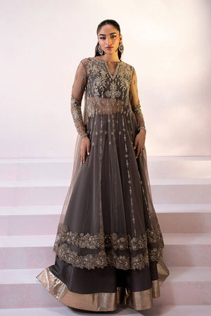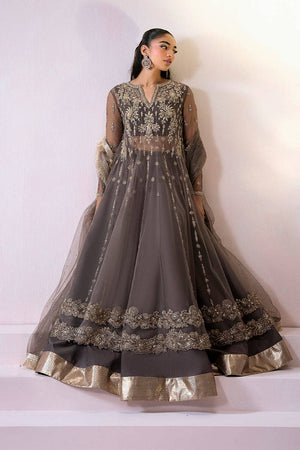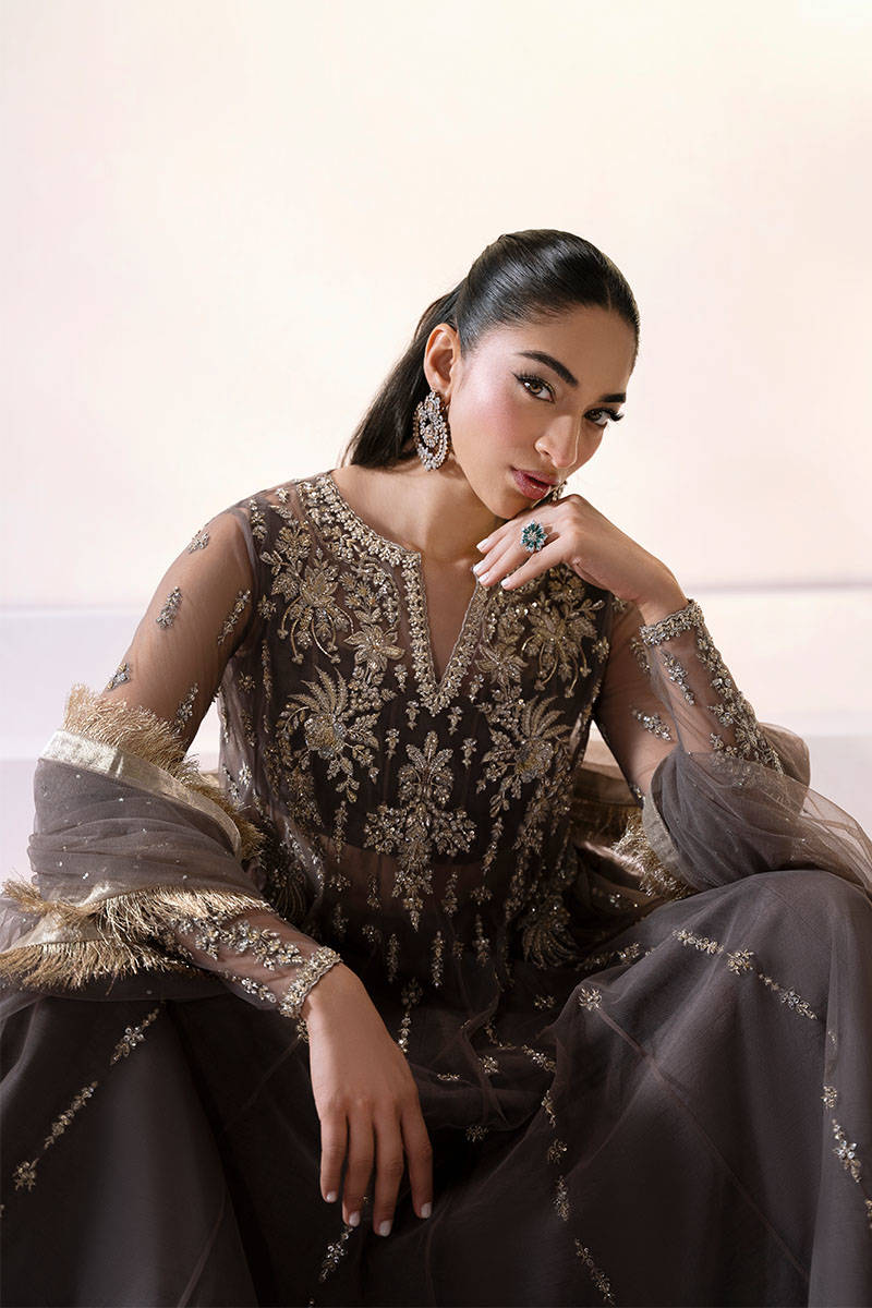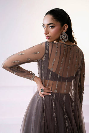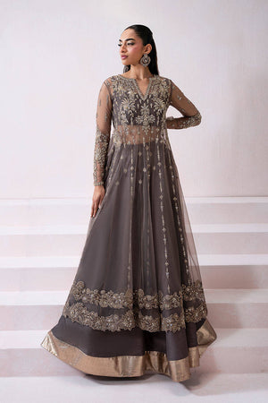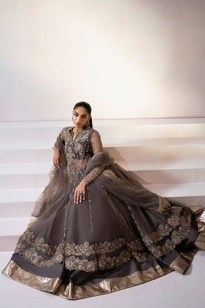 Starlight is a breathtaking grey net kalidar, featuring a delicately hand-embellished bodice, embroidered panels, and intricately detailed hem borders. Fitted sleeves with embellishments add a touch of elegance, while the raw silk inner blouse and lehenga in the same hue give the outfit a graceful, flowy silhouette. Finished with a golden lappa border for added richness and paired with a net mukaish dupatta adorned with classic kiran edging, this ensemble is perfect for any festive celebration—striking the perfect balance between tradition and ethereal charm.