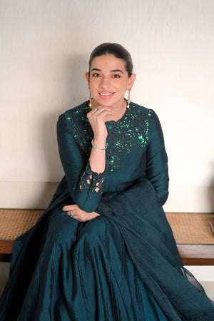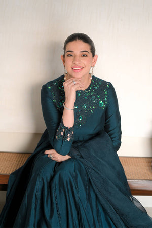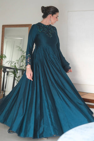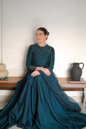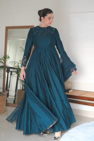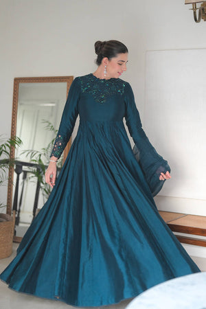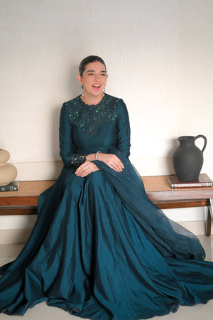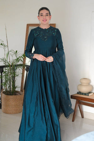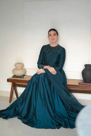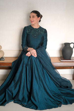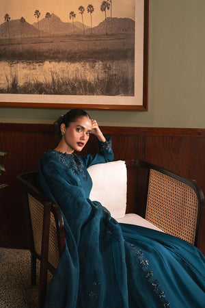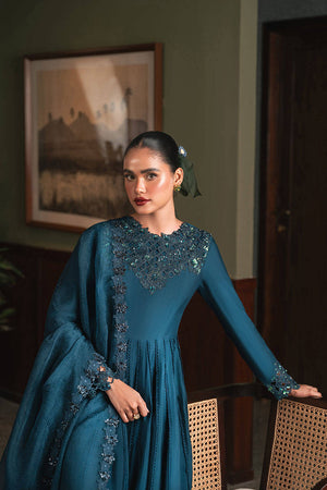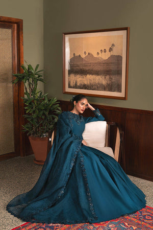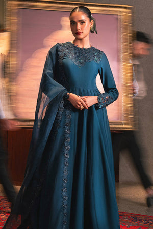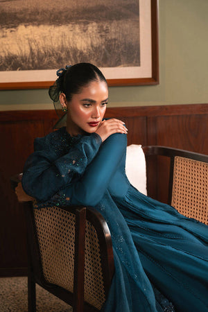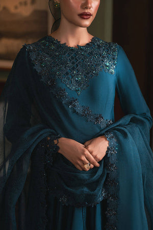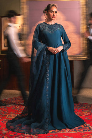 Immerse yourself in the enchanting elegance of Mohsin Naveed Ranjha's "Blue Lagoon" from the Chaye Coffee Luxury Pret Collection. This ensemble, in a mesmerizing shade of sapphire blue, features a floor-length peshwas crafted from pure cotton net. The intricate embroidery depicts a garden trellis adorned with climbing marigolds, while cutwork, sequins, and beads accentuate the neckline and sleeves, enhanced further with delicate trims. Paired with an organza block-printed dupatta in sweeping paisley patterns, the coordinating color harmonizes beautifully with the decorative floral trims on all four sides.