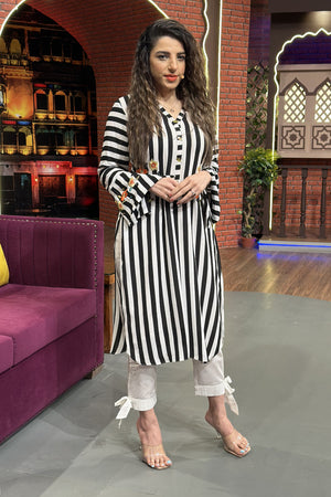 Stripes on crepe with colorful embroidery on front and back side seams, sleeves and upper back. Embellished with metal pieces and mirror work embroidery. Excellent drape and cut for all time favorite look.