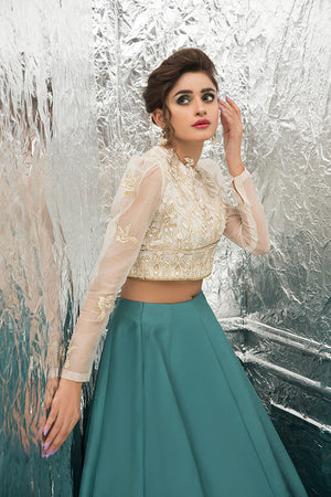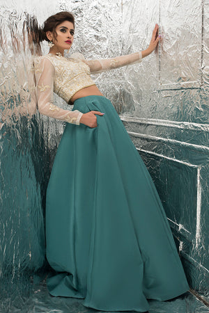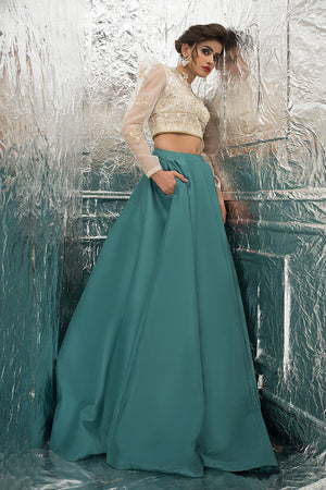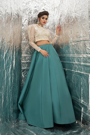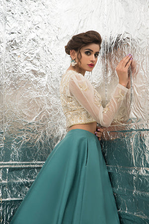 Sugar Swizzle – Bringing to life the quintessential Shikarga embellished Organza blouse with puffer sleeves paired with Teal raw Silk Lehanga and organza Duapta.