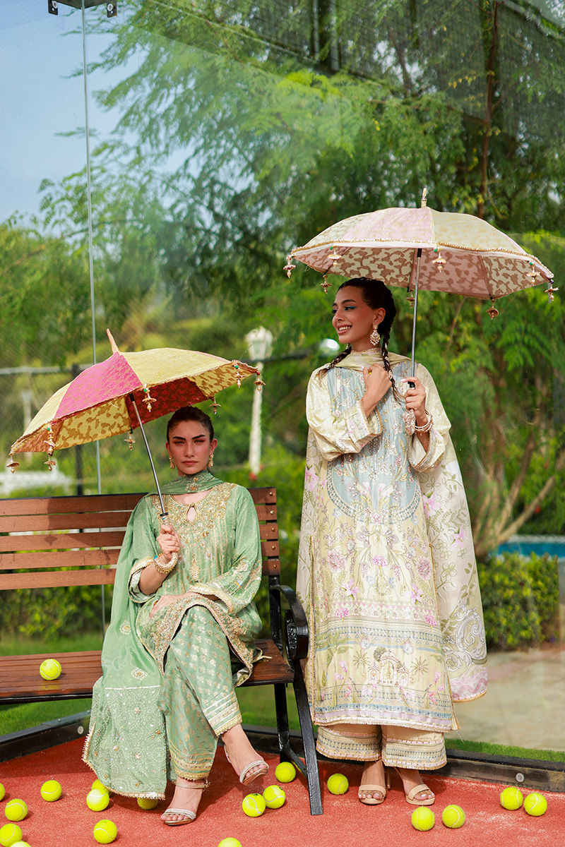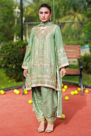 A chic sage green digital printed short shirt featuring a keyhole neckline, intricately embellished with gotta, dabka, Swarovski stones, nakshi, and sequins for a refined sparkle. It is paired with a pure raw silk narrow shalwar showcasing gold block print and delicate gotta details, and styled with a medium silk dupatta adorned with chunri block print and gotta finishing. A perfect harmony of tradition, craftsmanship, and contemporary elegance.