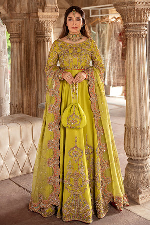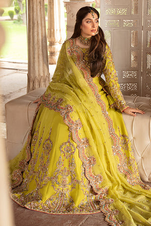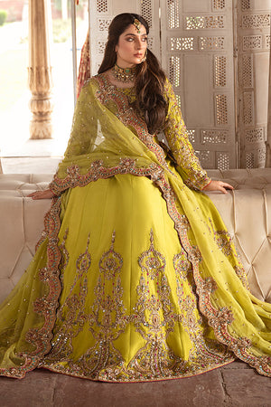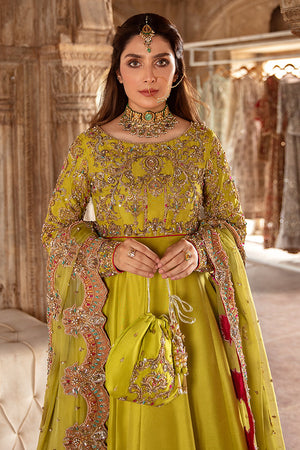The vibrant hue of green is perfect wear for the festive season. The lehnga choli silhouette is made of pure raw silk with fully embellished choli. The lehnga is intricately ornamented with dabka, sequin, sitara, and jewel like motifs. The outfit is paired with an organza dupatta with four side scallop embellishments, adding the accent shade of pink.