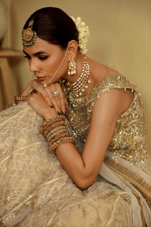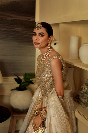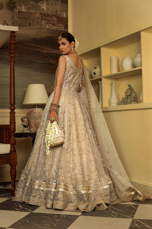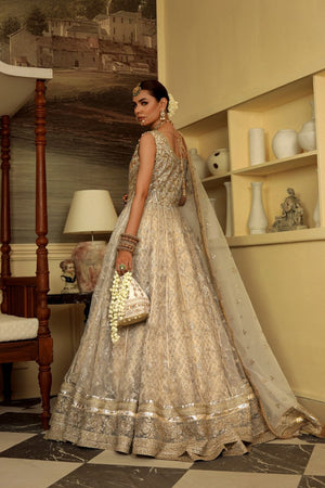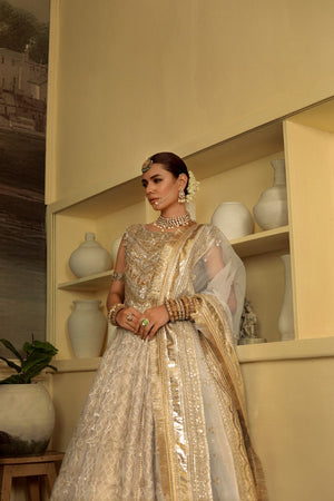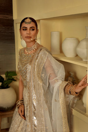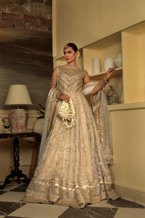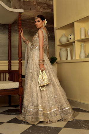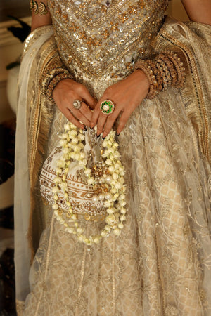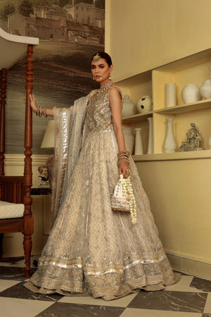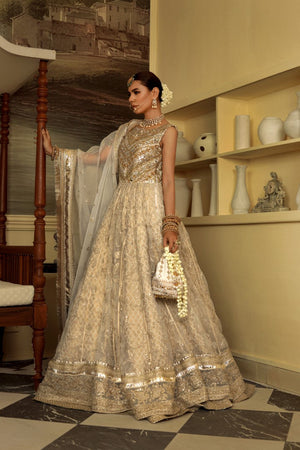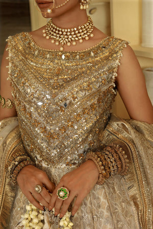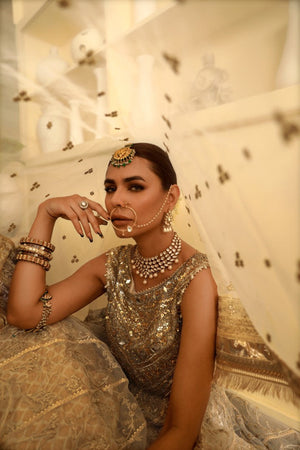 This festive pishwas is a stunning piece that will turn heads wherever you go. The gotta work ,sequins, pearls, mirrors and stones add a touch of glamour to the regal design, making it perfect for your special occasion.