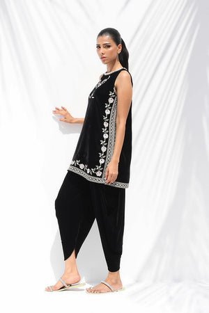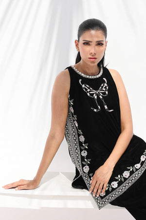 A vision of contemporary elegance, this ebony velvet shirt is tailored in a sleeveless A-line silhouette. Delicate embroidery adorns the neckline with a bow motif and traces the borders in soft floral vines. Paired with a velvet balloon shalwar that balances fluidity and structure, the look is finished with a pearl and diamante edged neckline, embodying modern glamour.