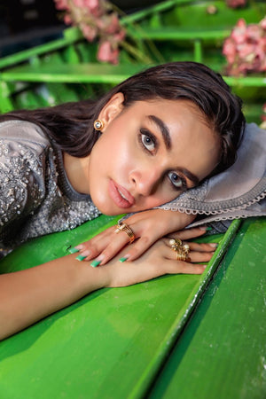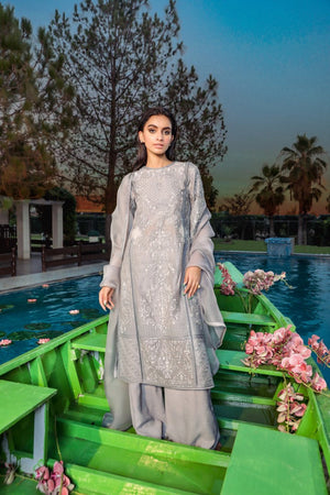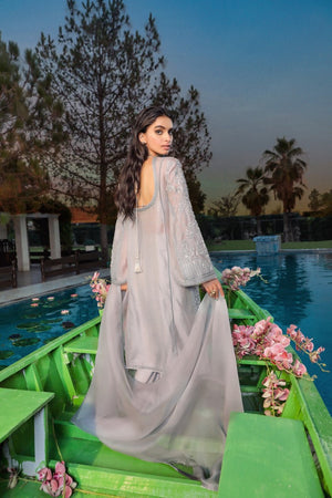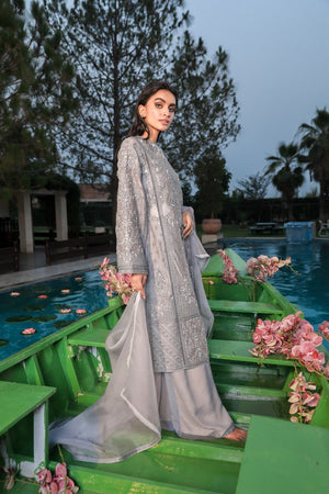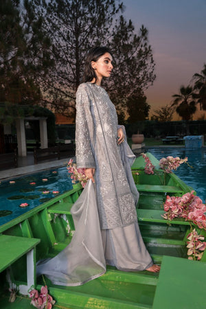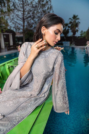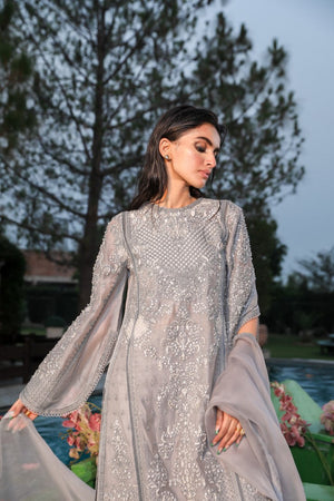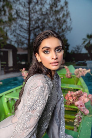 A knockout grey heavily embroidered and hand embellished long shirt, completed with cape sleeves and four sided embroidered borders organza dupatta. Paired with plain raw silk plazo pants.