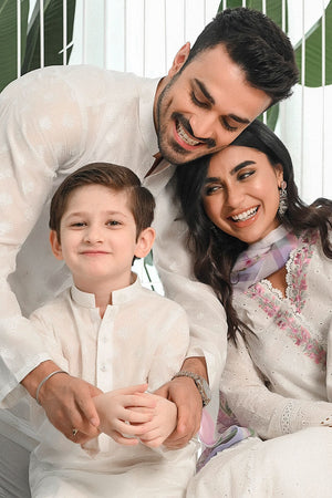 White self on self embroidered cotton kurta with straight dyed cotton pants.