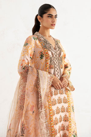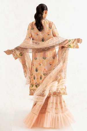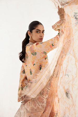 The outfit features a refreshing peach hue adorned with a captivating floral print that's further elevated by a zari work V neckline, adding a touch of opulence. The outfit is complemented by crushed and pleated sharara pants for a stylish and comfortable look. The printed organza dupatta comes with delicate gota lace.