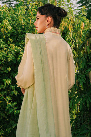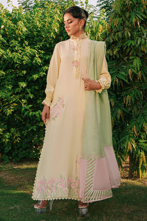 A subtle lime yellow long straight shirt, crafted from pure cotton net, is beautifully elevated with contrasting color motifs along the neckline, enhancing its overall charm. Intricate embroidery and embellishments adorn the hem, adding a touch of sophistication. Puff sleeves and a delicate neck collar further refine the design. The ensemble is completed with an organza dupatta in mint and powder pink, featuring stunning detailing on the edges to create a harmonious color balance. The look is finished with straight white pants for a polished and cohesive appearance.