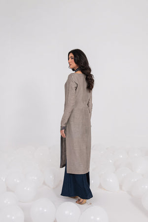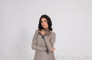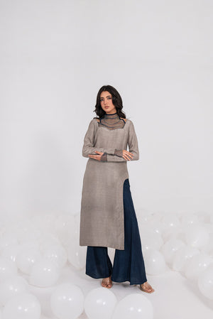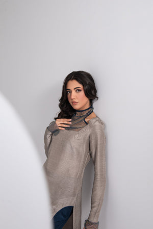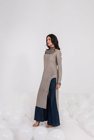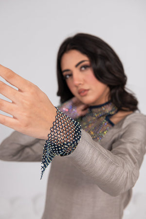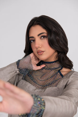 Immerse yourself in the glamour of "Swarovski Galore," where every movement captures the sparkle and shimmer of meticulously placed crystals. The net detailing on the neck and sleeves adds an extra layer of allure, creating a captivating interplay between sophistication and a touch of avant-garde.