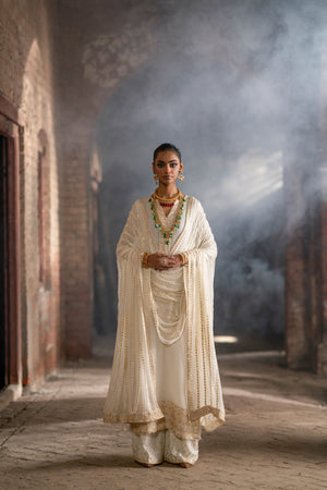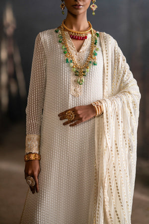 A long crinkle chiffon shirt crafted on continuous fabric with inner lining, featuring detailed borders and an ornate neckline, beautifully matched with an embroidered grip trouser. Completing this ensemble is a crinkle chiffon dupatta adorned with Mukesh-style embroidery and elaborate four-sided embroidered borders, adding a touch of sophistication to the overall look.