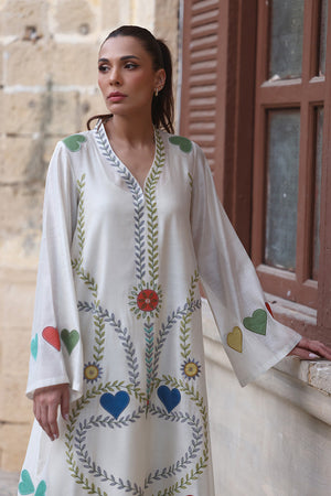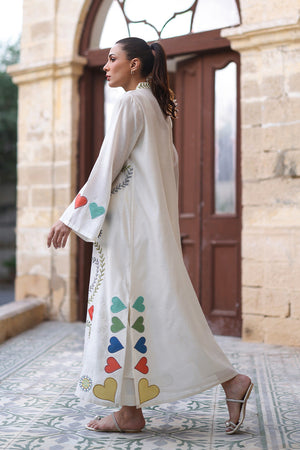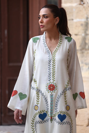 Radiating elegance, this ivory hued kaftan is embroidered with playful applique hearts and floral sprigs in earthy tones. Crafted from khaddi silk, the effortless silhouette is paired with a matching crepe slip and pure rawsilk trousers.
