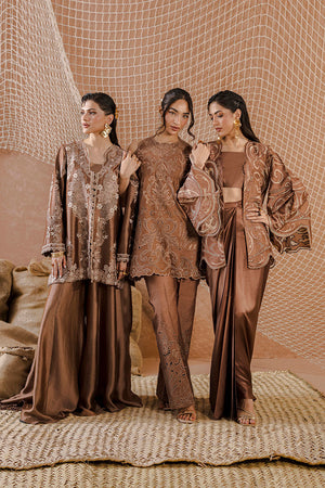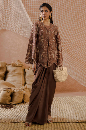 A sheesha silk jacket detailed with beige khaddi silk appliqué and a cutwork neckline. The jacket features wide kimono sleeves and is worn over a sheesha silk bandeau. The look is completed with a shamose silk draped skirt that creates natural fluidity.