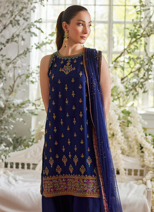 Look perfectly put together with this midnight blue Short shirt adorned with intricate gold embroidery, featuring traditional motifs adorns the whole front of the shirt. The hemline of the kurta is finished with a richly embroidered border incorporating floral and geometric patterns that complement the overall outfit. The pure net dupatta is embellished with delicate sequins. The outfit is completed with pure raw silk Dhaka pants.