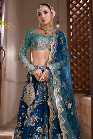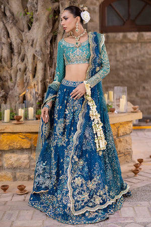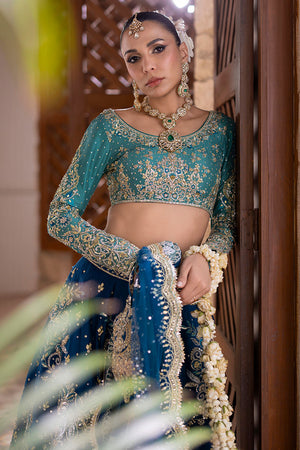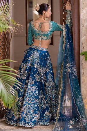 A Whimsical Peacock Bridal Draped in mesmerizing peacock blue, this lehnga blooms with floral patterns in radiant peacock hues, brought to life through exquisite Banarsi zardozi handwork. It is paired with a graceful sage green choli, delicately embroidered with fine zardozi detailing and soft accents of blue resham, creating a harmonious balance of color and craft. The look is completed with a breathtaking ombré dupatta, adorned with zardozi appliqué birds and shimmering gota embellishments, echoing the joy and vibrance of a festive celebration. Perfectly playful yet regal, this ensemble is made for the bride who wishes to dazzle on her mehndi day.