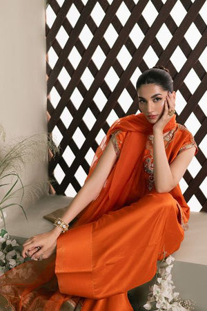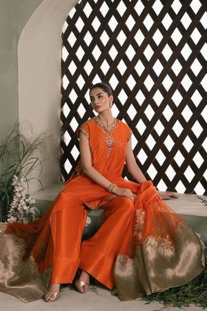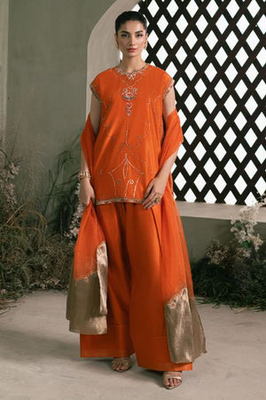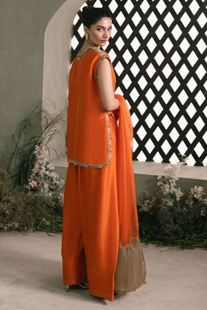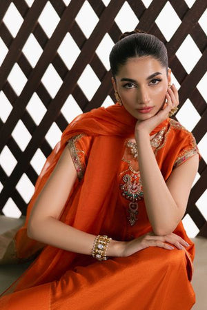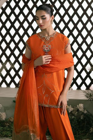 Make a striking statement with this rust-hued short boxy shirt, expertly paired with a flowing shalwar. The ensemble's elegance is elevated by intricate gotta and handwork embellishments, showcasing exceptional craftsmanship. A delicate organza dupatta patch adds a touch of sophistication, while the tissue details provide a subtle sheen. This beautifully crafted outfit seamlessly blends traditional Pakistani flair with modern chic, perfect for formal events, weddings, or cultural celebrations.