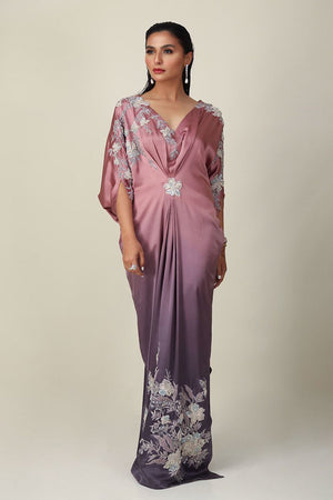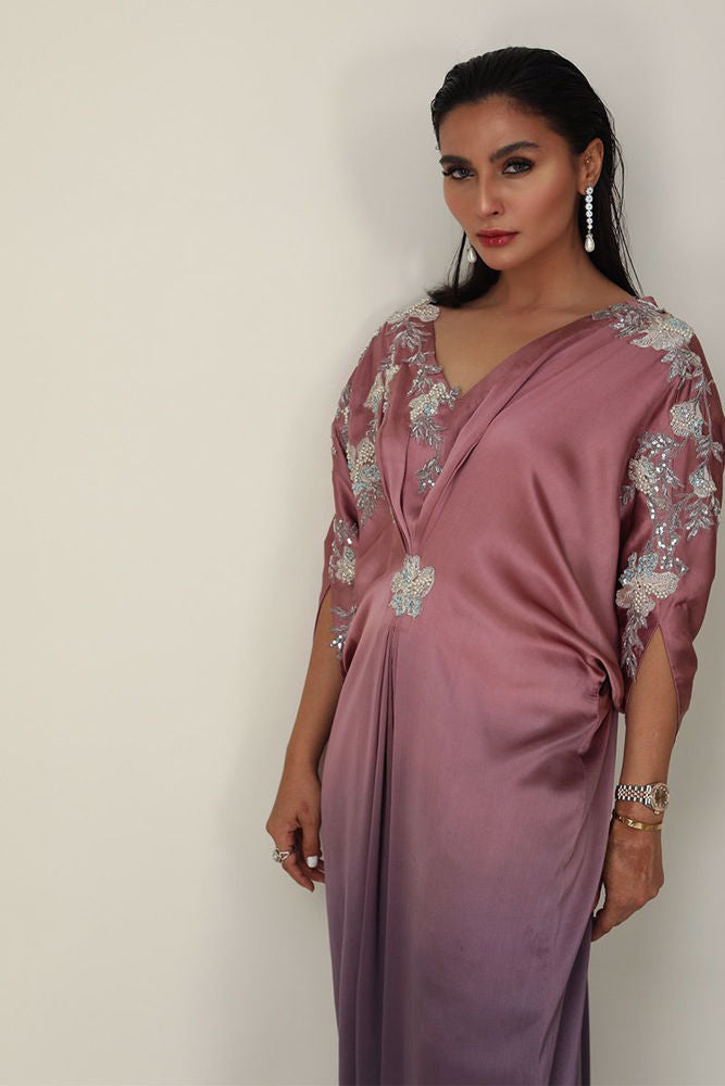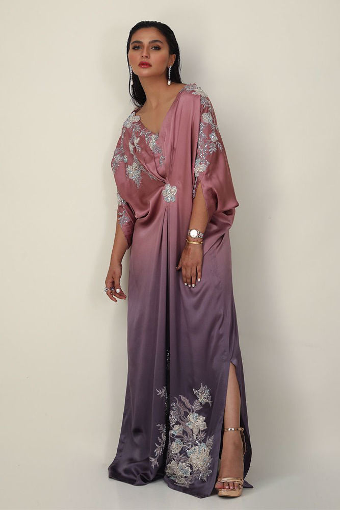 A beauteous pure charmeuse kaftan in ombre style nude pink shines in the crowd. The exquisite embellishments around the neckline comprises of resham floral with 3D ornaments of pearls, cutdana, sequence and stones scattered along the torso.
