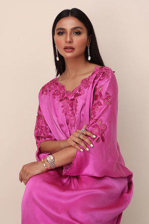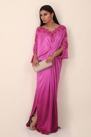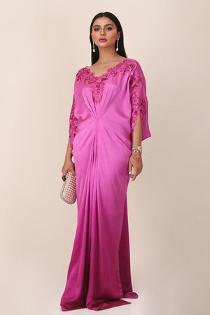 The new age fusia ombre style charmeuse kaftan with contemporary V-neckline. handcrafted with floral embroidery of resham and organza creating the elegant cutwork. Pleats on the waist gives the body a perfect hour glass shape. The outfit is uplifted with 3D embroided bird on the back.