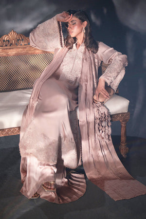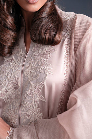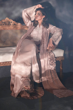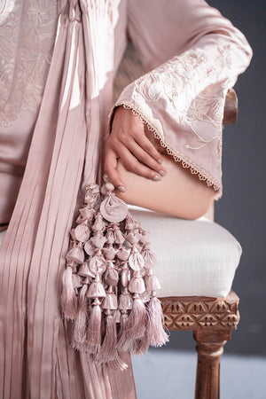 This tea-pink creation, rendered in lustrous pure satin silk, exudes an air of romance. The long, flowing kameez is adorned with lace-like embroidery of vegetal vines that unfurl gracefully along the neckline, hem, and sleeves. Pleated trousers add subtle texture, while the dupatta, pleated and embroidered at its ends, mirrors the botanical motifs of the kameez. The ensemble is finished with delicate trims, their refined simplicity elevating the overall composition.