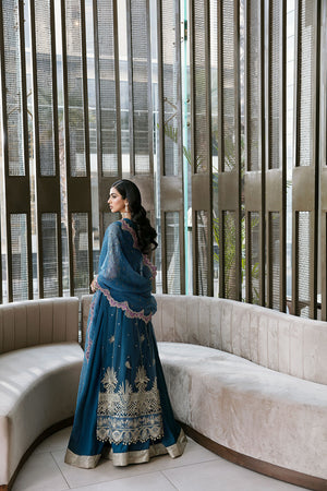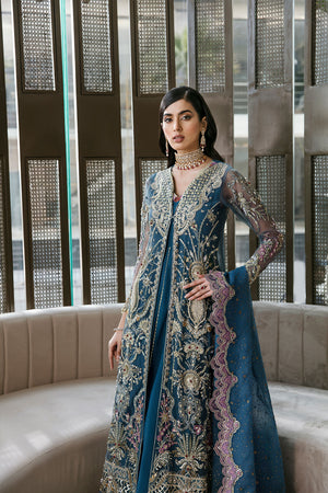 Teal affair is a net front slit classic gown paired with organza dupatta adorned with embellishment of pearls, cutwork and sequin work. The outfit comes with a long silk inner gown entailing golden sequins work on the hem with fully hand & machine embellished net gown.