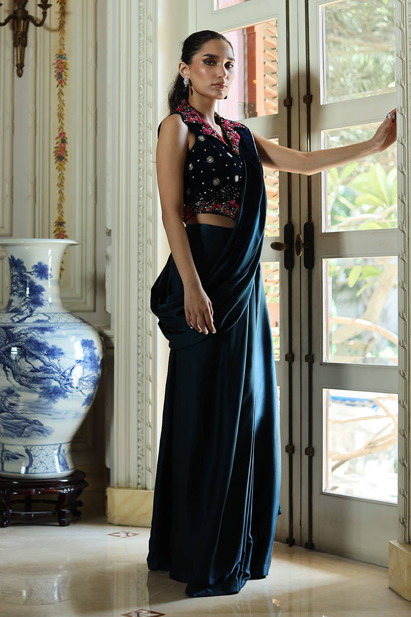 French knot roses and mukesh work on an uber chic, collared velvet blouse. Paired with a pure charmeuse satin and velvet sari. The sari is a modern, pre-pleated, pre-stitched sari that can be zipped up like a skirt with a pleated drape.
