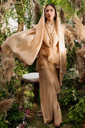 Terracotta is a pure organza wrap featuring a delicately embellished braid around the neckline, offering a look that's both sophisticated and effortlessly chic. The cuffed sleeves with pleated detailing add a modern edge, while a matching belt cinches the waist for a flattering silhouette. Paired with same-color silk slip and paired with flowy silk pants, this ensemble is the perfect blend of grace and contemporary style.