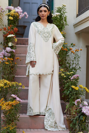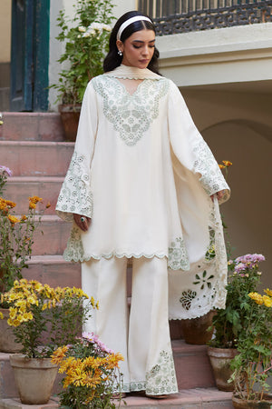 A cream georgette short shirt adorned with delicate sage schiffli embroidery on the neckline, sleeves, and daaman. Paired with wide-leg pants featuring slits and schiffli detailing on the hem, and a georgette dupatta with oversized cutwork borders.