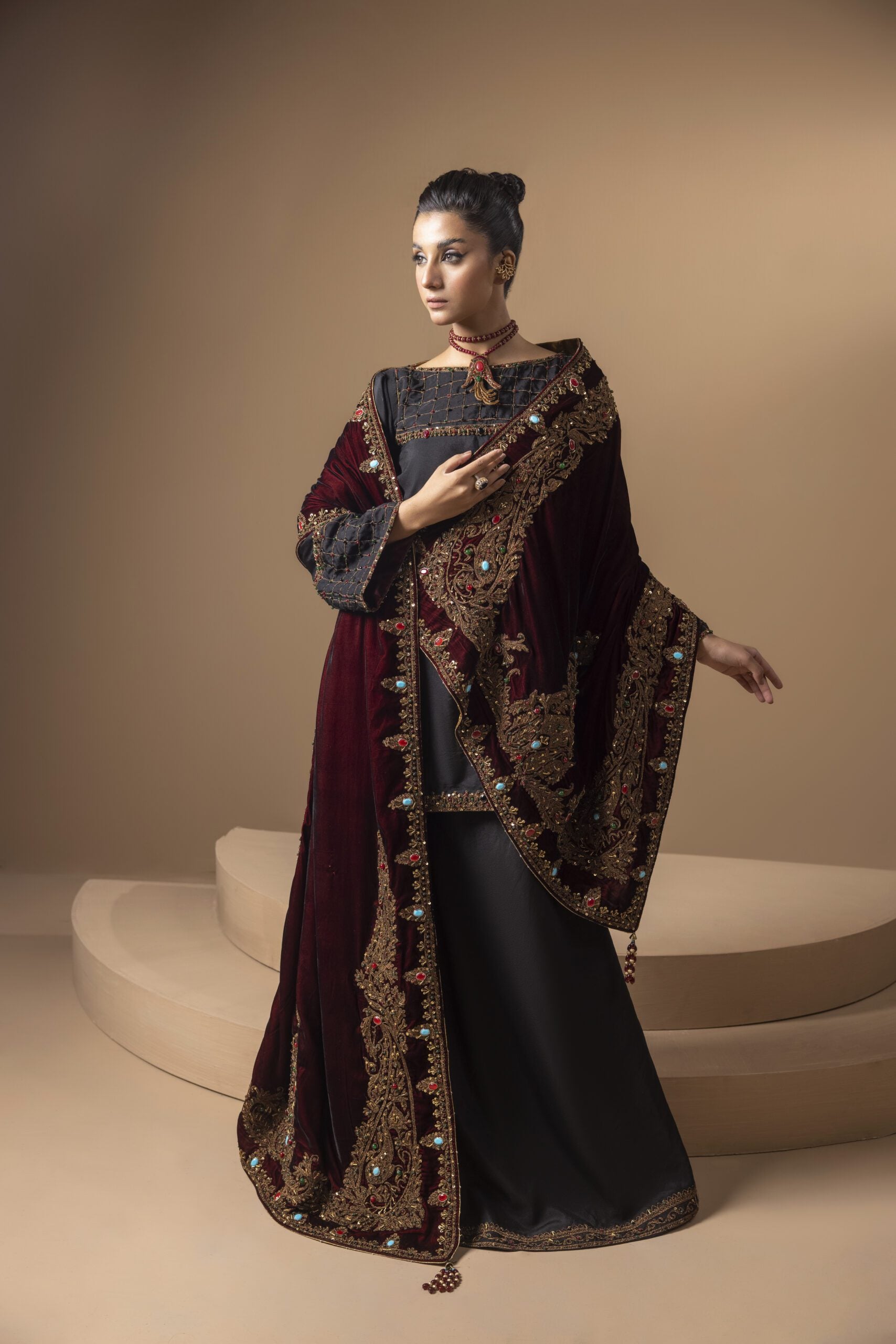 A tempting Pure Velvet “The Crimson Turquoise Shawl” with a blend of deep antique gold doori work, submerged by rich jewel pieces with an amalgam of rubies, emeralds, jade, coral, and agate, lined with Chiffon Masori. Shawl length 2 yard 30 inches and width 38 inches
