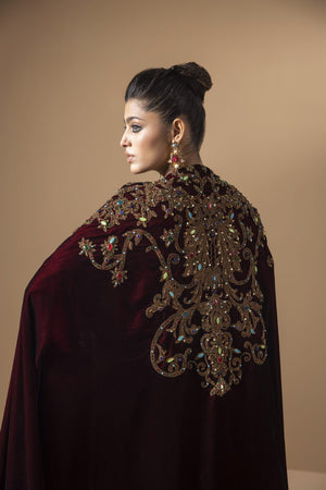 A tempting Pure Velvet “The Sparkling Helen Shawl” with a blend of deep antique gold doori work, submerged by rich jewel pieces with an amalgam of rubies, emeralds, jade, coral, and agate, lined with Chiffon Masori. Shawl length 2 yard 30 inches and width 38 inches.