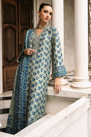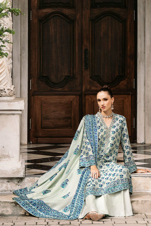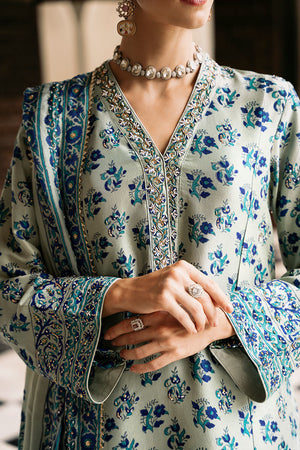This mesmerizing ensemble is a dreamscape. It blends captivating textures and colors. The long, raw silk shirt in taupe and green features a meticulously detailed neckline adorned with sparkling stones, cut dana, and pearls. A captivating discharge print in shades of blue dances across the fabric, creating an ethereal dreamscape. Flowing izaar pants complete the look, while a luxurious medium silk dupatta adds a final touch of elegance.
