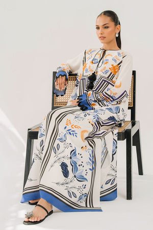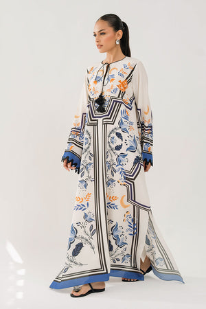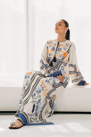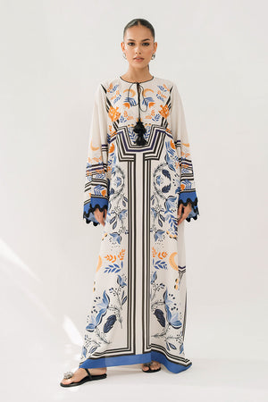 'A crepe kaftan with a striking mix of bold patterns in royal blue, mango yellow, and ebony on an ivory base, captures our love for understated elegance.
